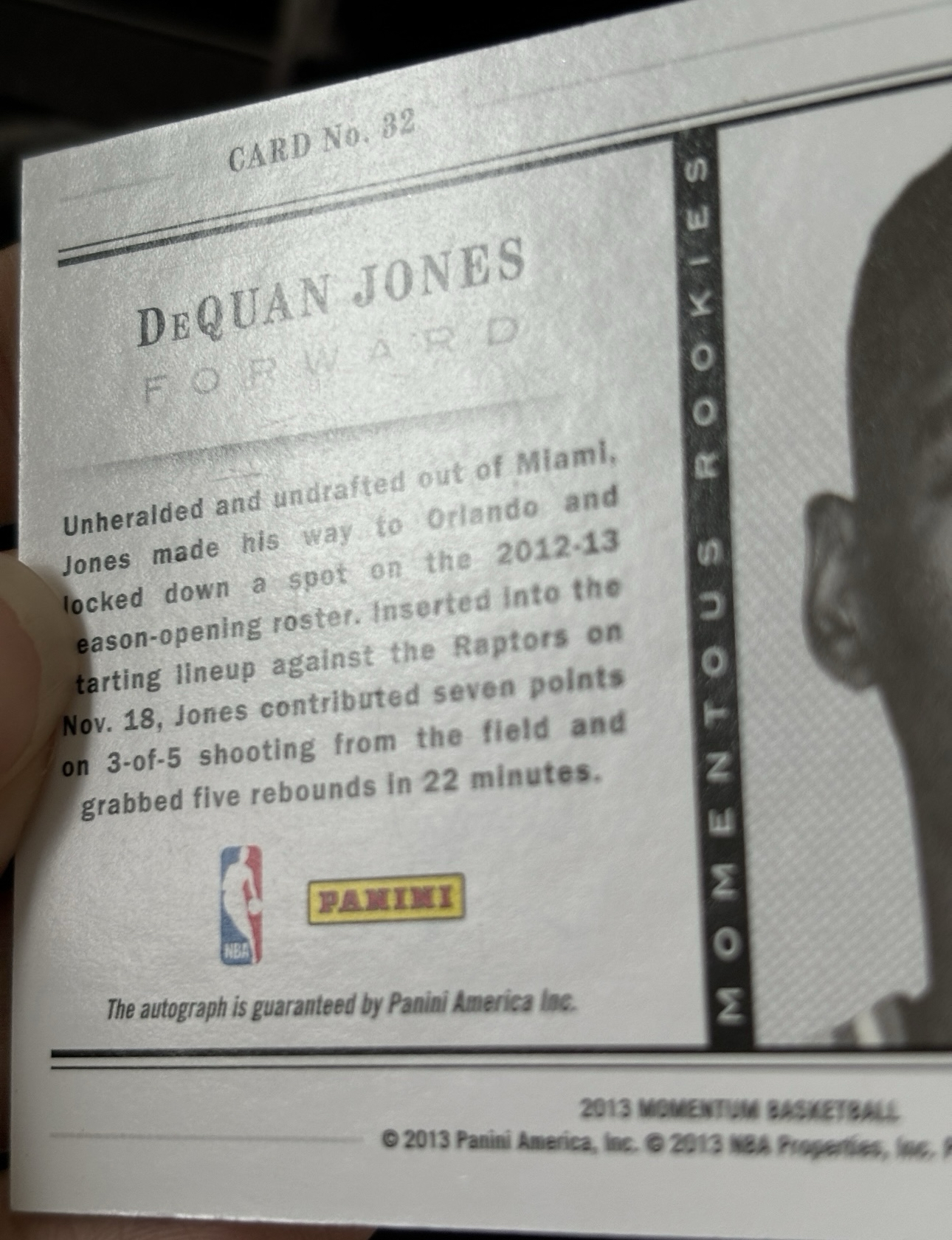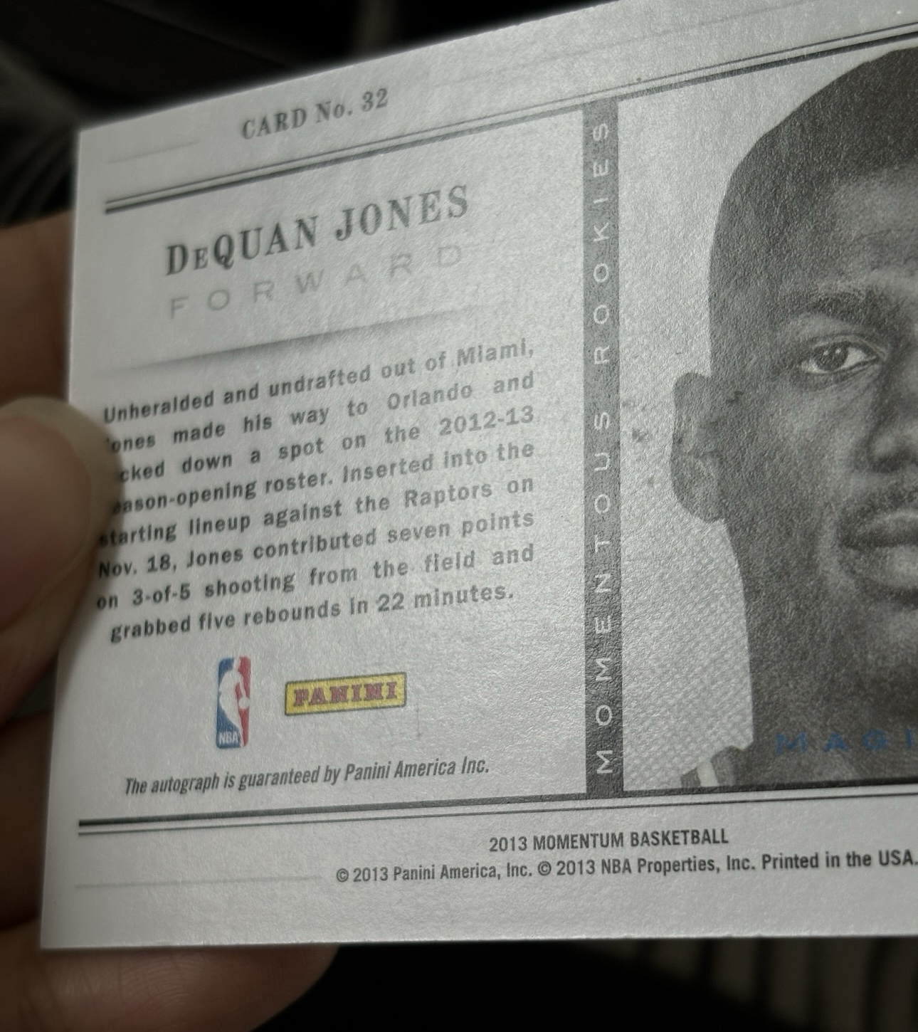 2013 Panini Momentum DeQuan Jones 《快乐卡舍接寄拍》魔术 戴奎恩 琼斯 新秀 25/49编 签字墨迹清晰 魔门屯系列 瑕疵见图 投资收藏必备