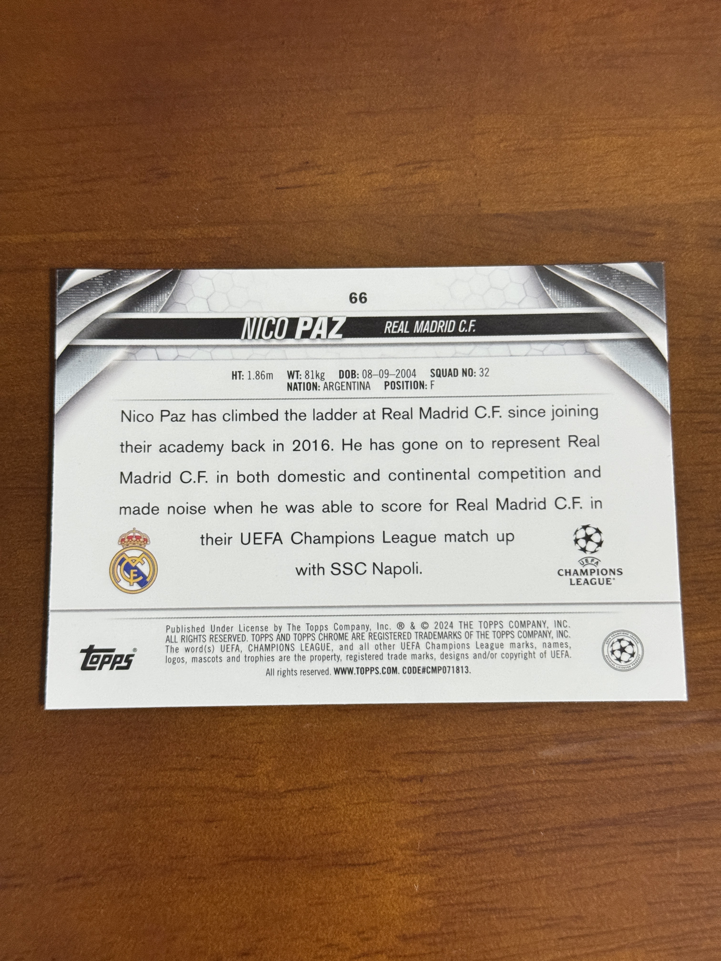 2024 Topps Chrome Niko Paz 欧冠 新秀RC 皇家马德里 尼科 帕斯 帕兹 /250编 阿根廷 科莫 过人王 未来可期 专收必备 卡品如图