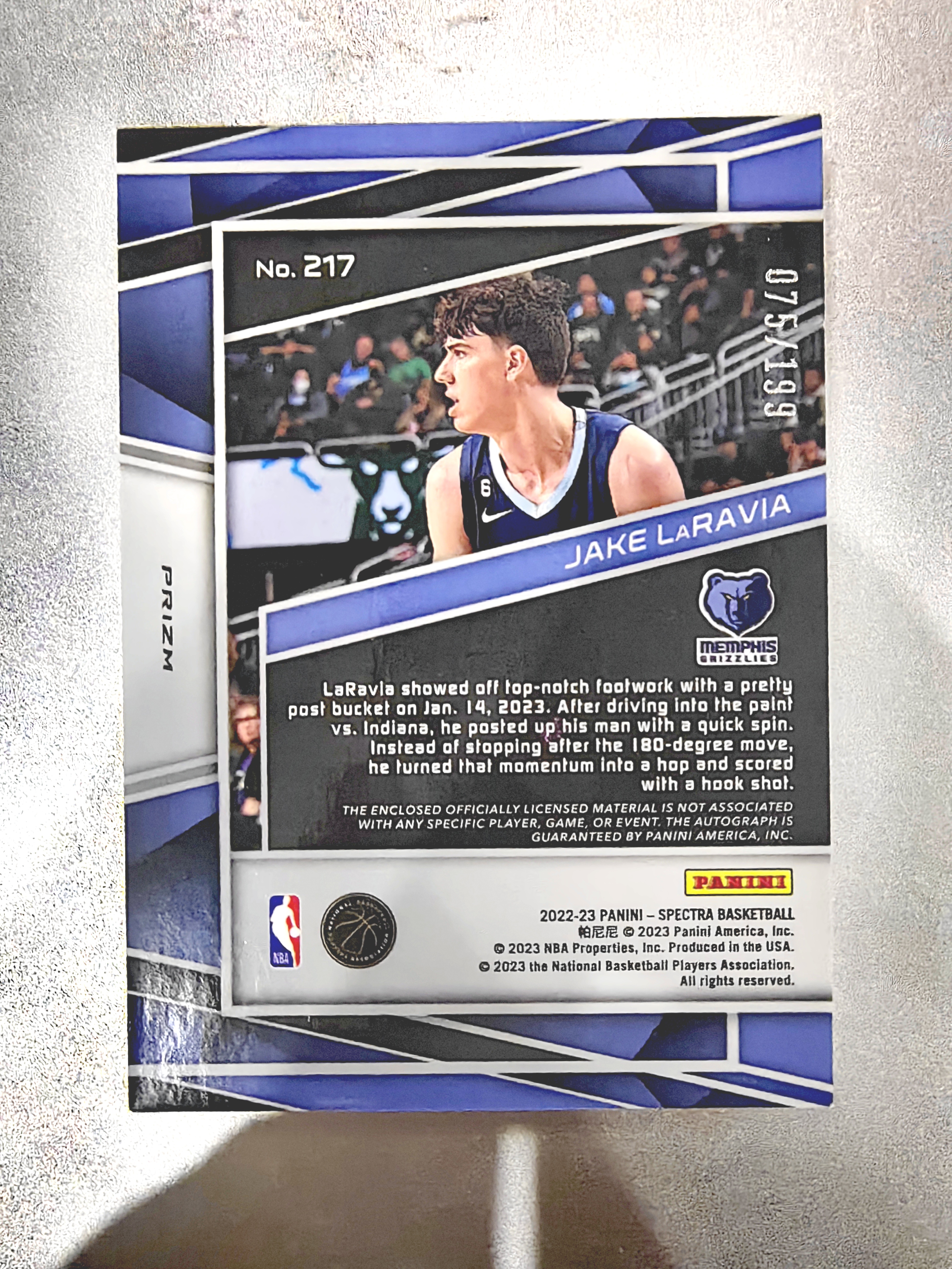 2022-23 Panini Spectra Jake LaRavia RC 杰克 拉拉维亚 新秀 签字 卡签 rja 光谱 正折射199编 灰熊 新秀年 湖人 球衣 物料东契奇 里弗斯 勒布朗 队友