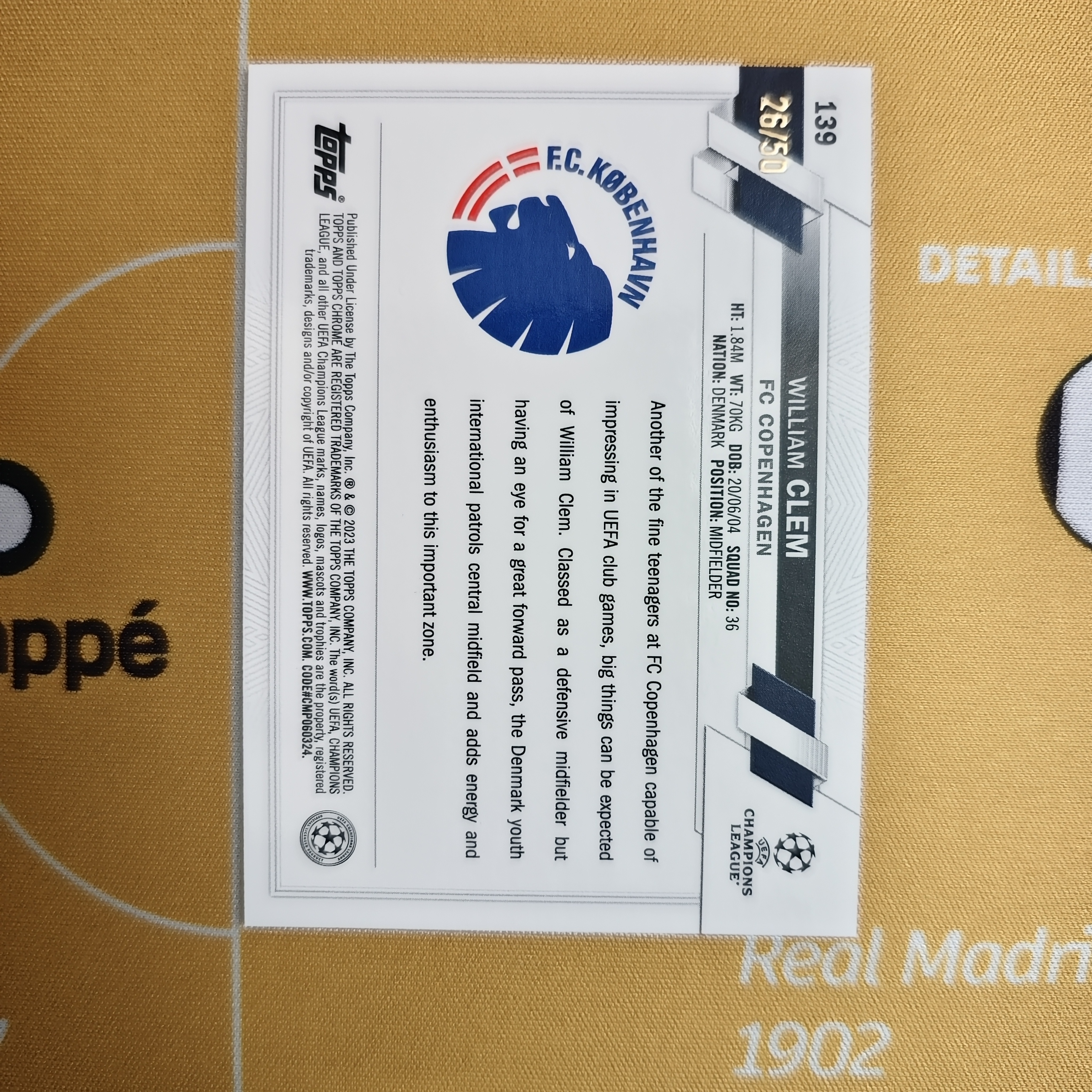 2023 Topps Chrome William Clem RC 威廉 克莱姆 21岁新秀 哥本哈根 丹麦 26/50橙碎冰折 未来可期 专收必备 通行卡品