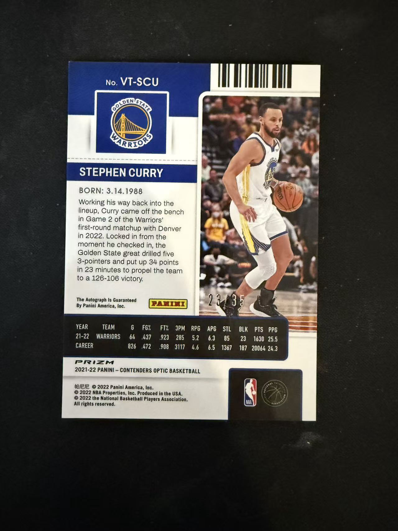 2021-22 Panini Contenders Optic Stephen Curry 勇士 斯蒂芬 库里 三分王 23/35编 老兵签 卡签 签字 球票 optic 红折 折射 收藏必备