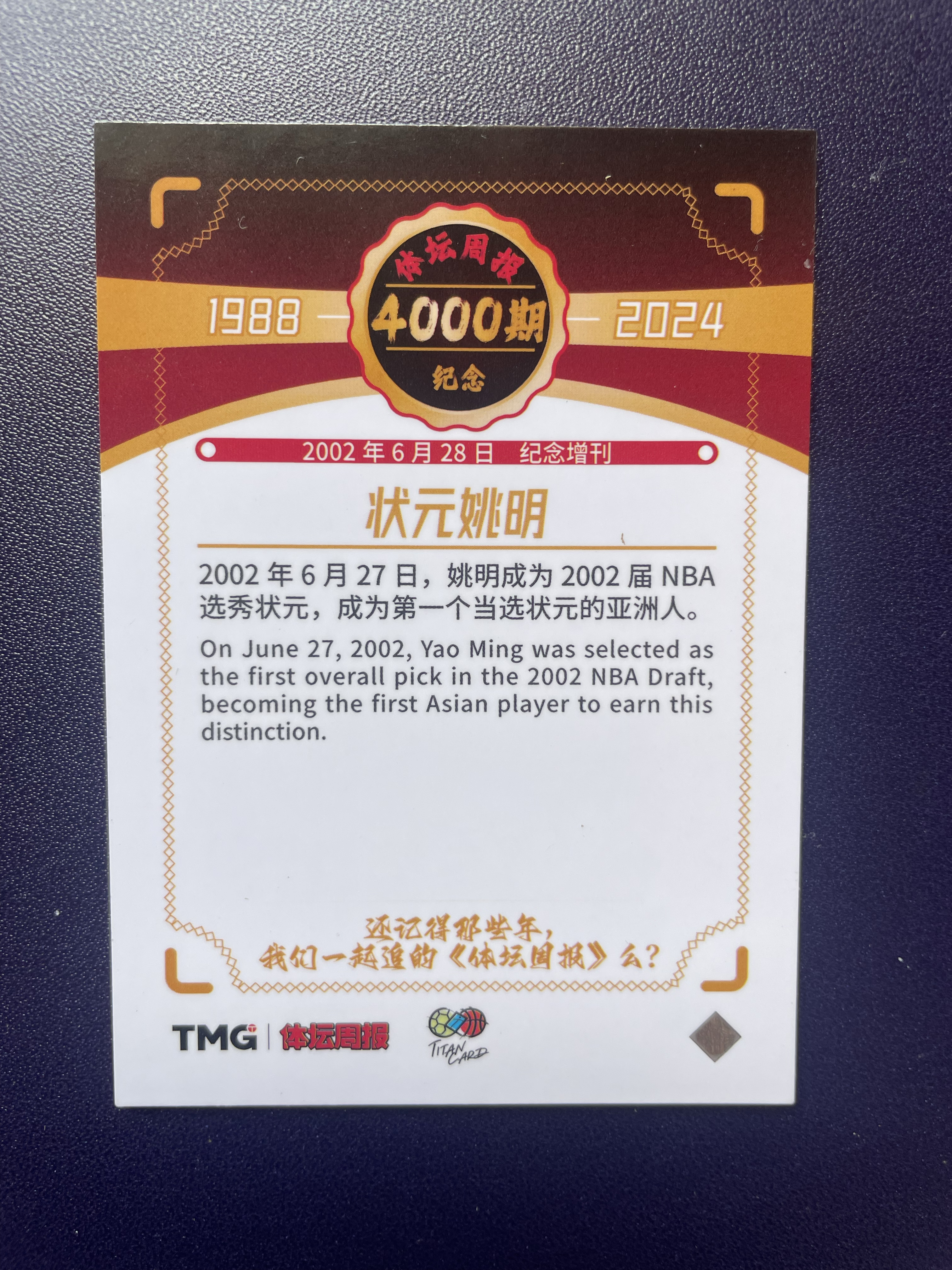 2024-25 TMG 体坛周报 Yao Ming 状元姚明 成为2002届NNA选秀状元,成为第一个当选状元的亚洲人 纪念意义非凡 细节如图不保卡品 玖玖