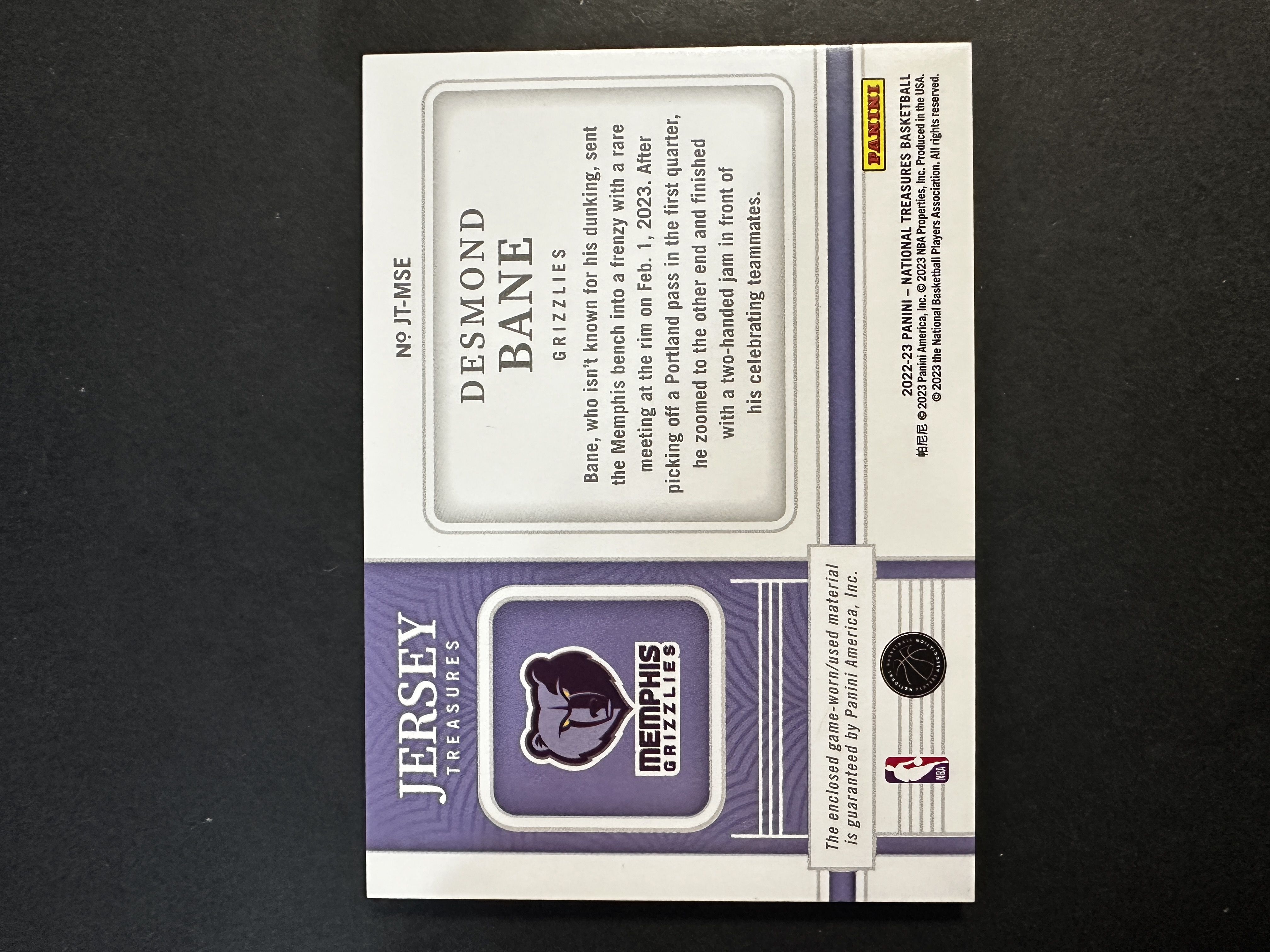 2022-23 Panini National Treasures Desmond Bane 灰熊 国宝 戴斯蒙德 贝恩 球衣 暴力切割 25编 落场球衣 亲穿 GU 卡背小印 卡品如图(王)