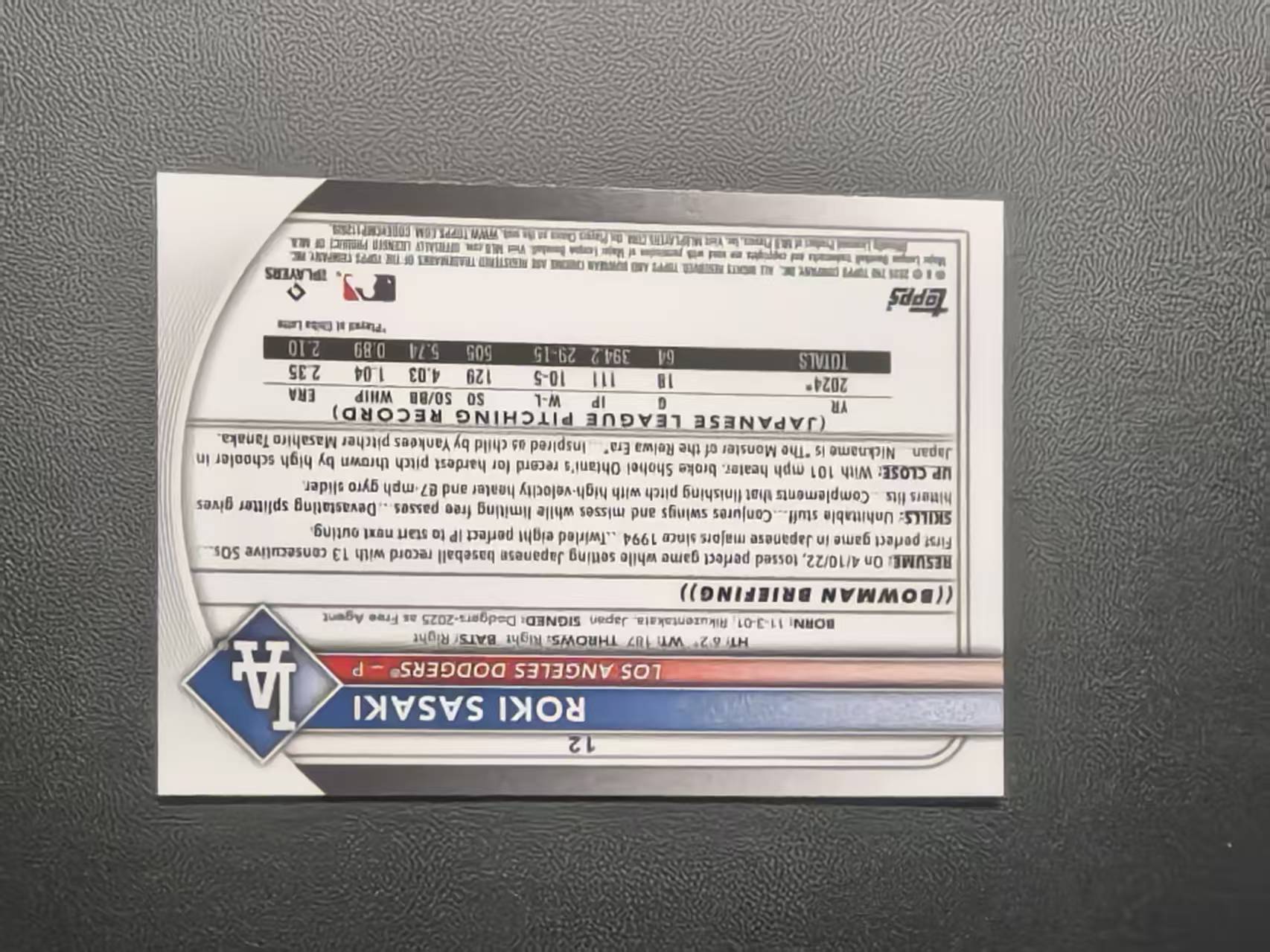 2025 Topps Bowman Roki Sasaki MLB 洛杉矶道奇 冠军队成员 佐佐木朗希 新秀 RC 脉冲折 279/399编 专收必备