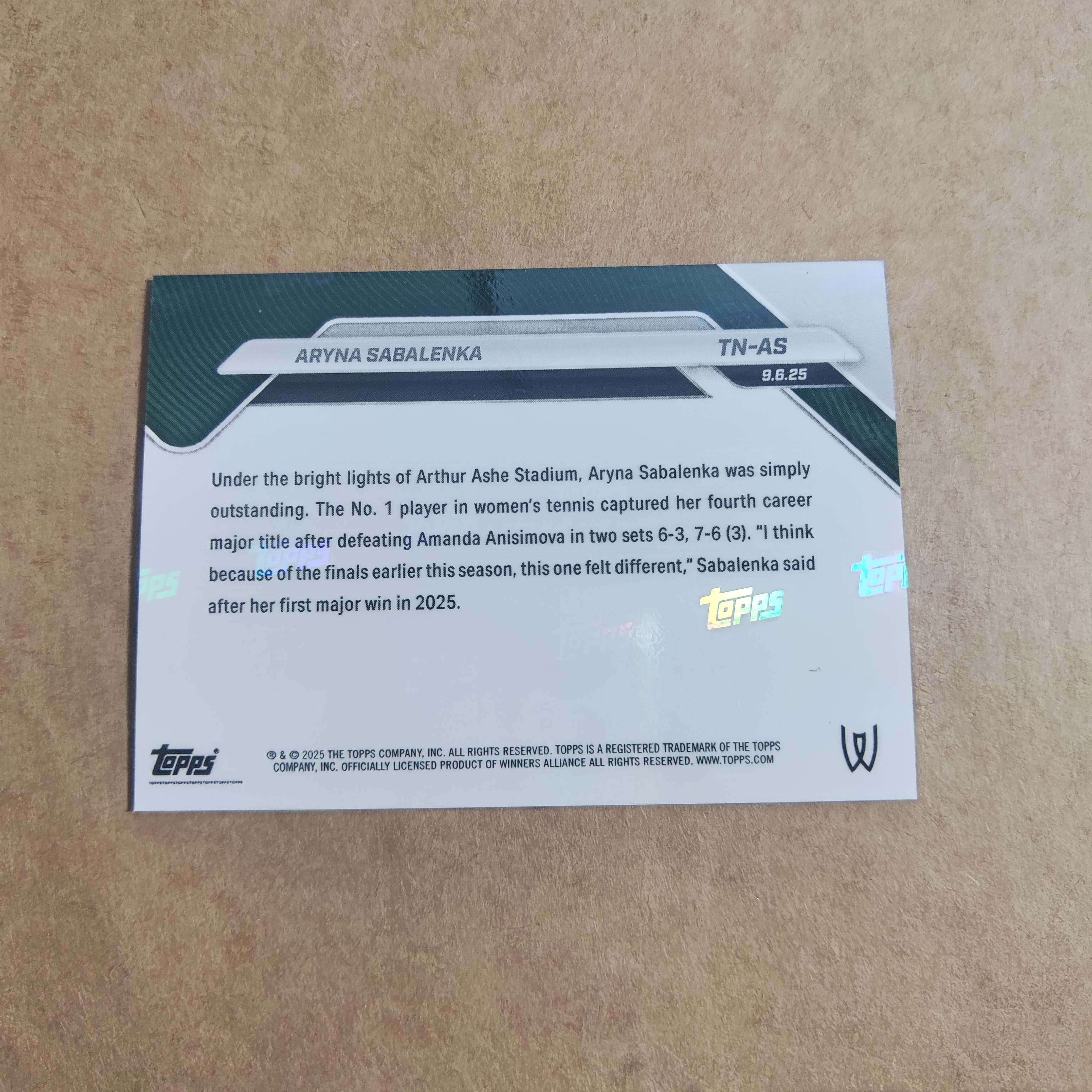 【HADE拍卖-免费上拍】2025 Topps Now 网球Aryna Sabalenka 白俄罗斯巨星 四座Major冠军得主 阿丽娜萨巴伦卡 纪念卡 HD0025-archer