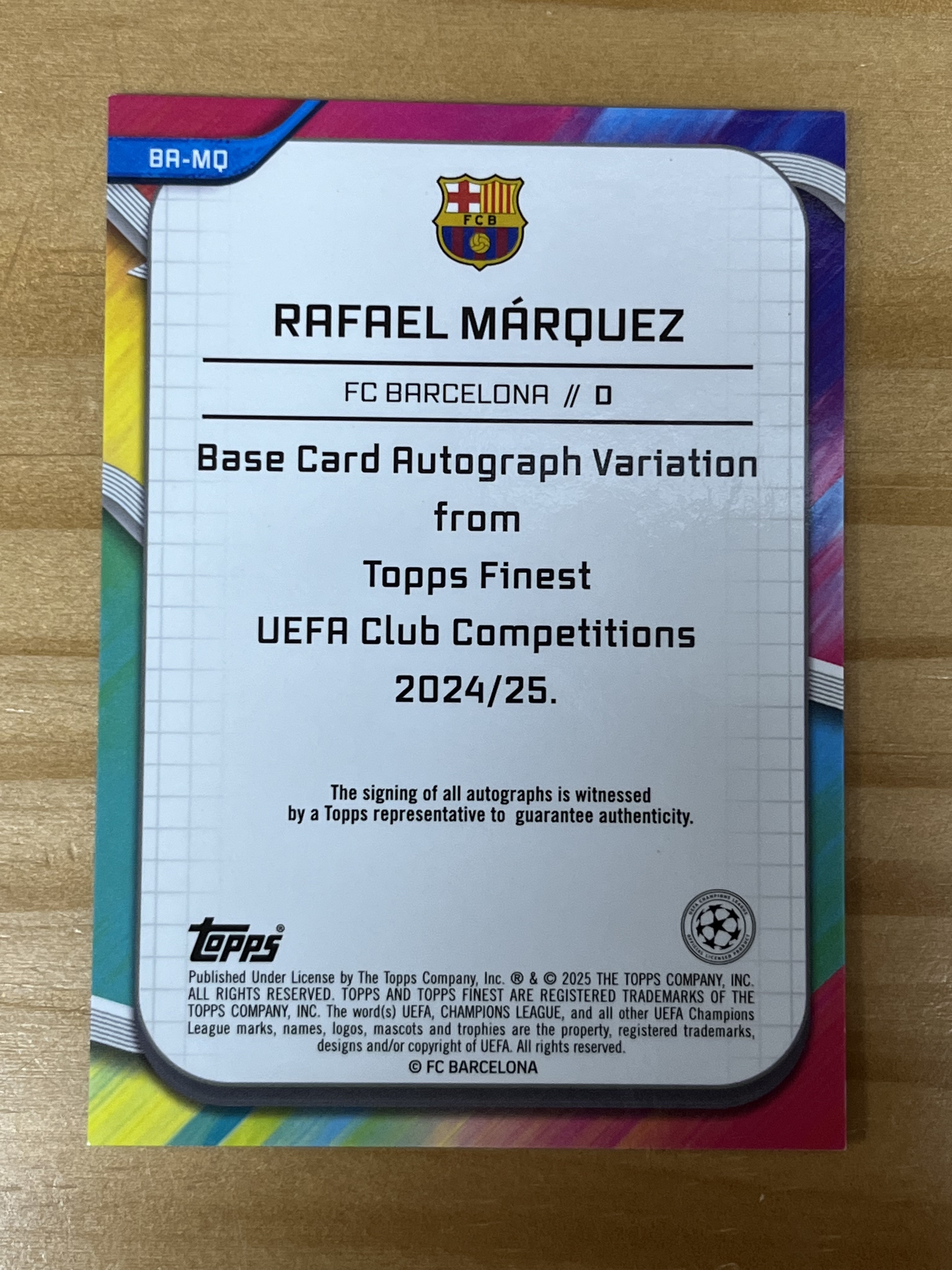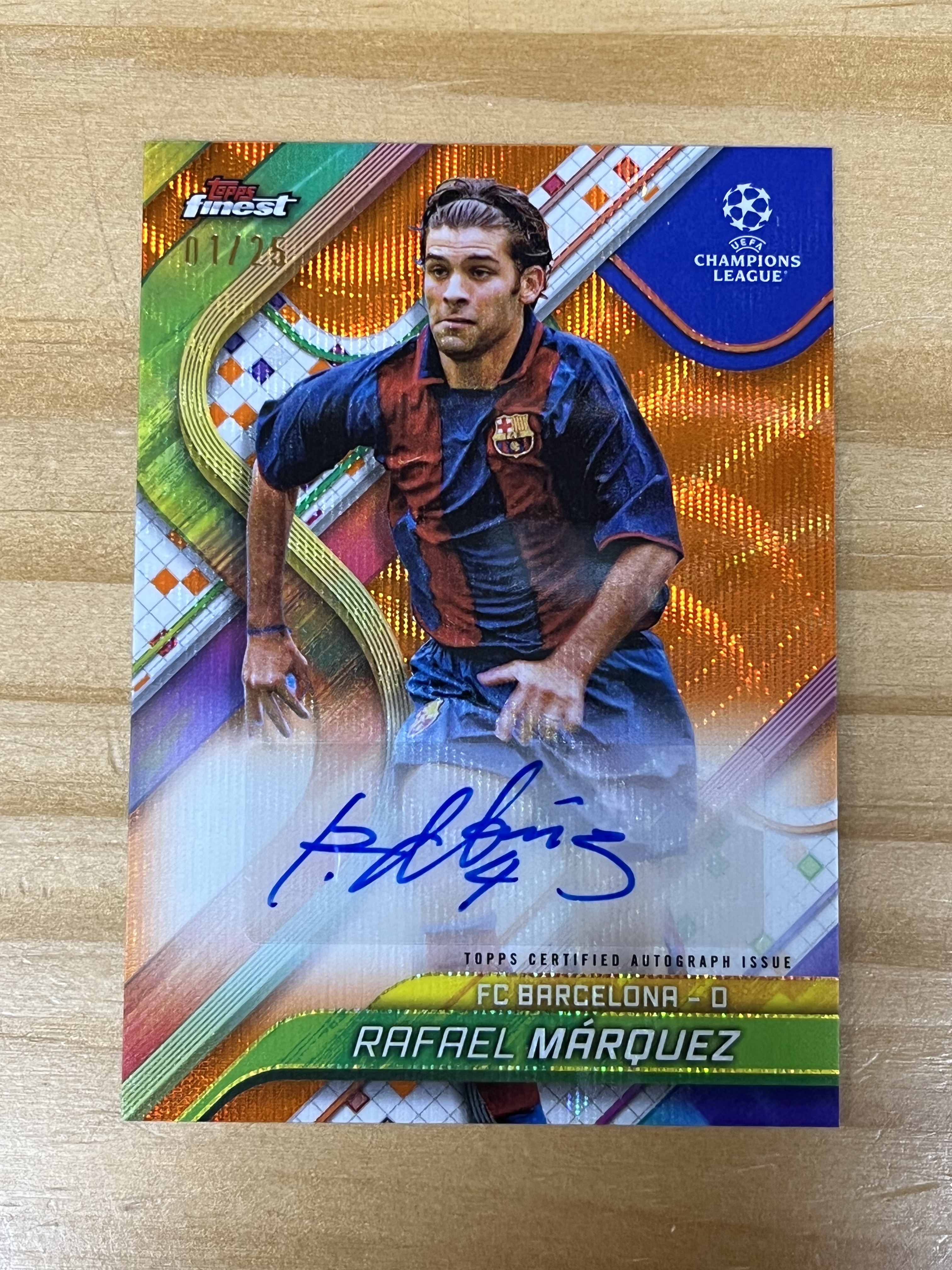 2024-25 TOPPS FINEST UEFA 欧冠  巴萨  Rafael Mrquez  拉斐尔 马克斯  base 橙波纹折签字卡 1/25  首编  花布袋
