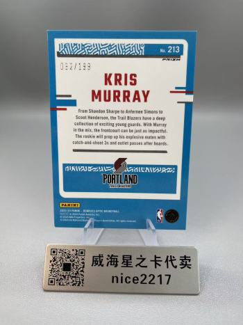 卡品:劳烦仔细看图!!!截标之前可找客服寻要细节照片或者细节视频,一旦出价默认接受卡品(不接受一系列没拍特写,自己没看仔细不想要等理由退换货)截标后不提供任何细节图!如无图片特殊展示瑕疵均为通行品相,一般prizm optic 等系列薄卡的小划痕印刷线,镜面有划痕属于正常品相,国宝IMM等系列厚卡的小白边小白角翘角钝角等,都属于通行品相。完美主义者请直接购买PSA10或者公博金标,发货之后不退不换(购卡的买家拆快递的时候也请拍开箱视频以便维护自己的权益)