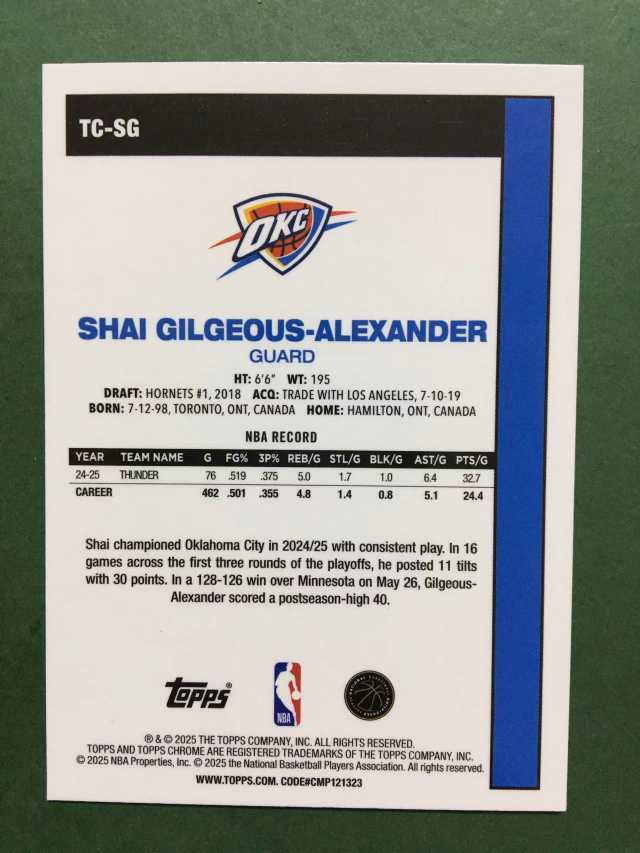 2025 Topps Chrome Shai Gilgeous-Alexander TC 元年 雷霆 亚历山大sga mojo折 迷宫折 base 联盟门面 Fmvp 总冠军 超级巨星 卡品如图#叔