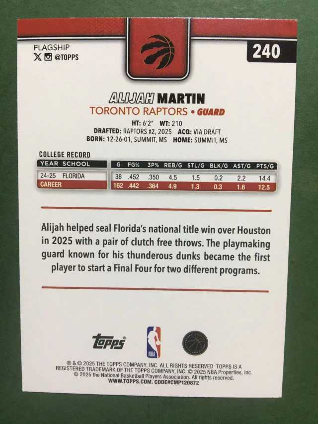 2025 Topps Flagship Alijah Martin RC 元年 新秀 猛龙 阿莱贾 马丁 银折 折射 正base VJ 弗拉格同届 巴恩斯 迪克同队 未来可期 凑套必备 卡品如图#曦
