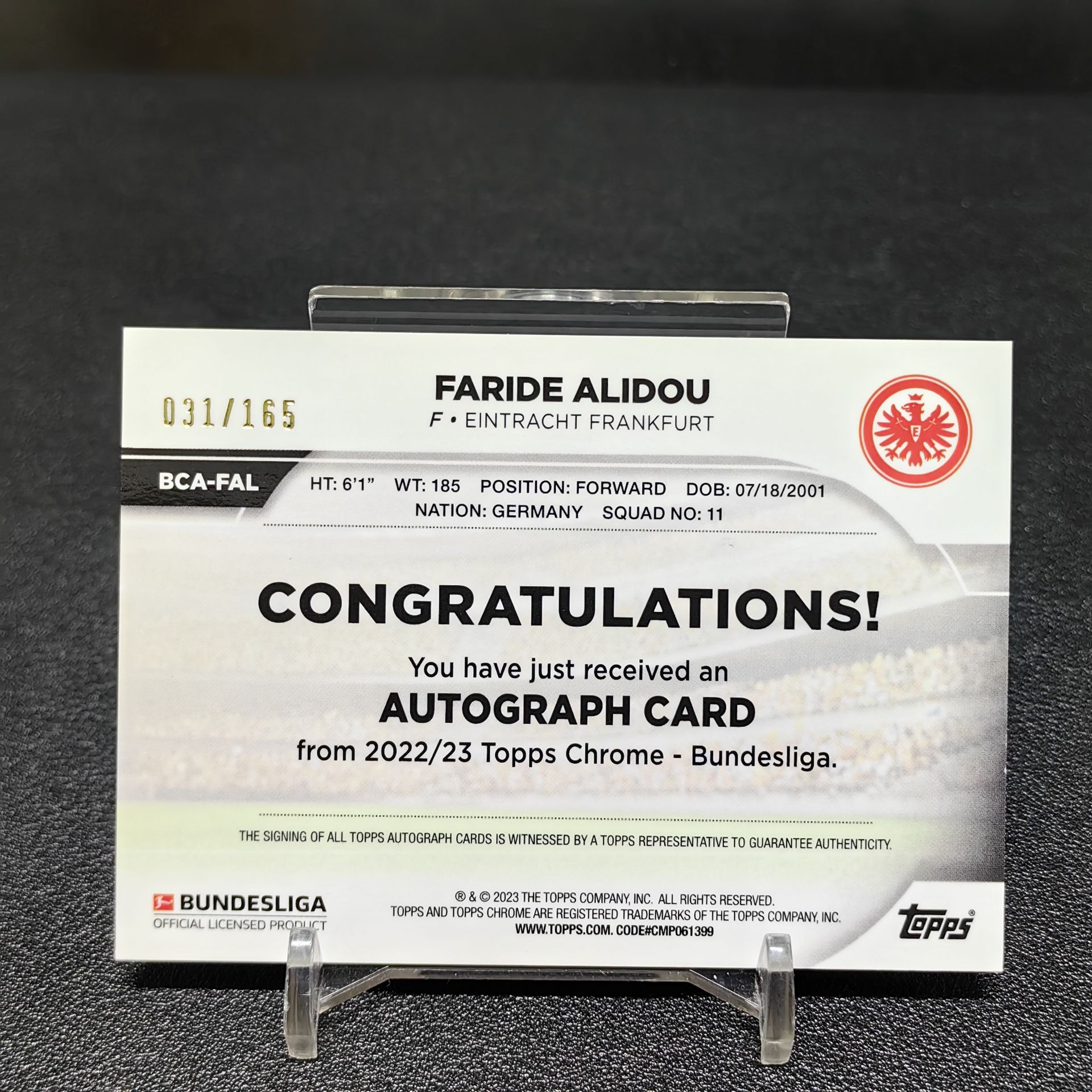 【浩行拍卖 截标预付82%】2023 Topps Chrome faride alidou 德甲 法兰克福 法里德 阿里杜 新秀 RC 签字 银龙鳞折 折射 31/165编 专收必备 瑕疵看图「谐茵」1106C02龘