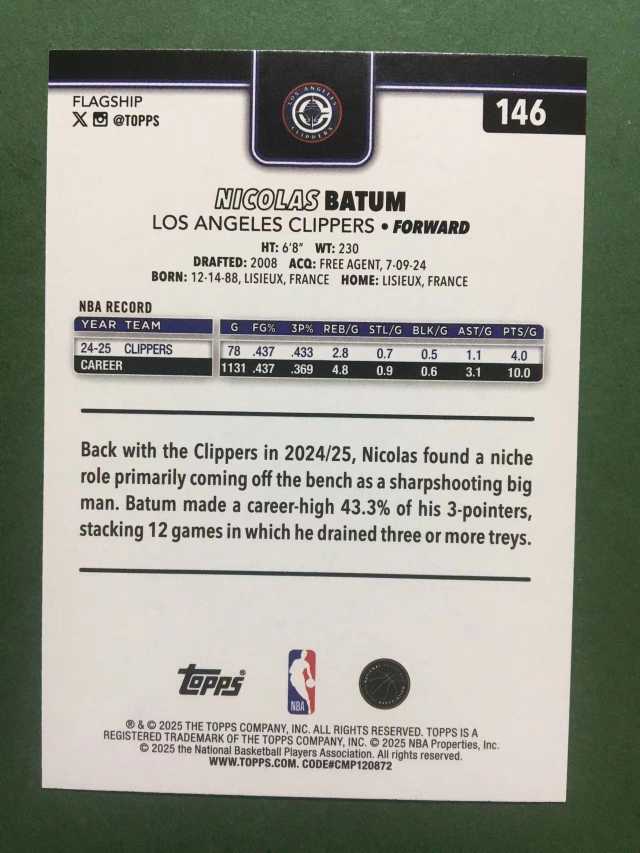 2025 Topps Flagship Nicolas Batum 元年 快船 尼古拉斯 巴图姆 2025编 铜折 折射 base 哈登 伦纳德队友 防守悍将 新赛季夺冠热门 凑套必备 卡品如图#纪