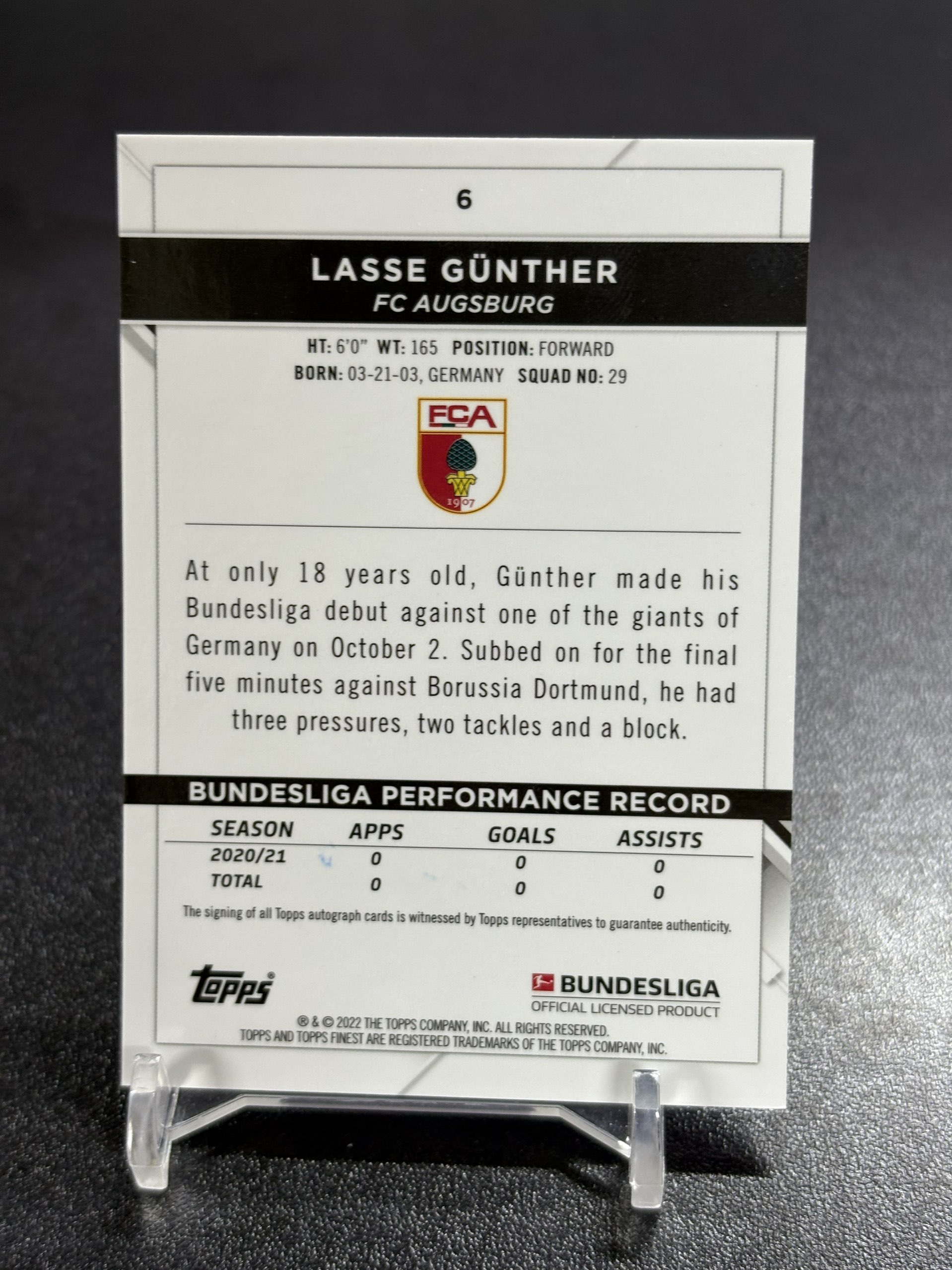 【浩行拍卖 截标预付82%】2022 topps finest lasse gunther 德甲 奥格斯堡 拉塞 金特 rc 新秀 银折 折射 签字 瑕疵看图 专收必备「稳妥587重上」1106龘