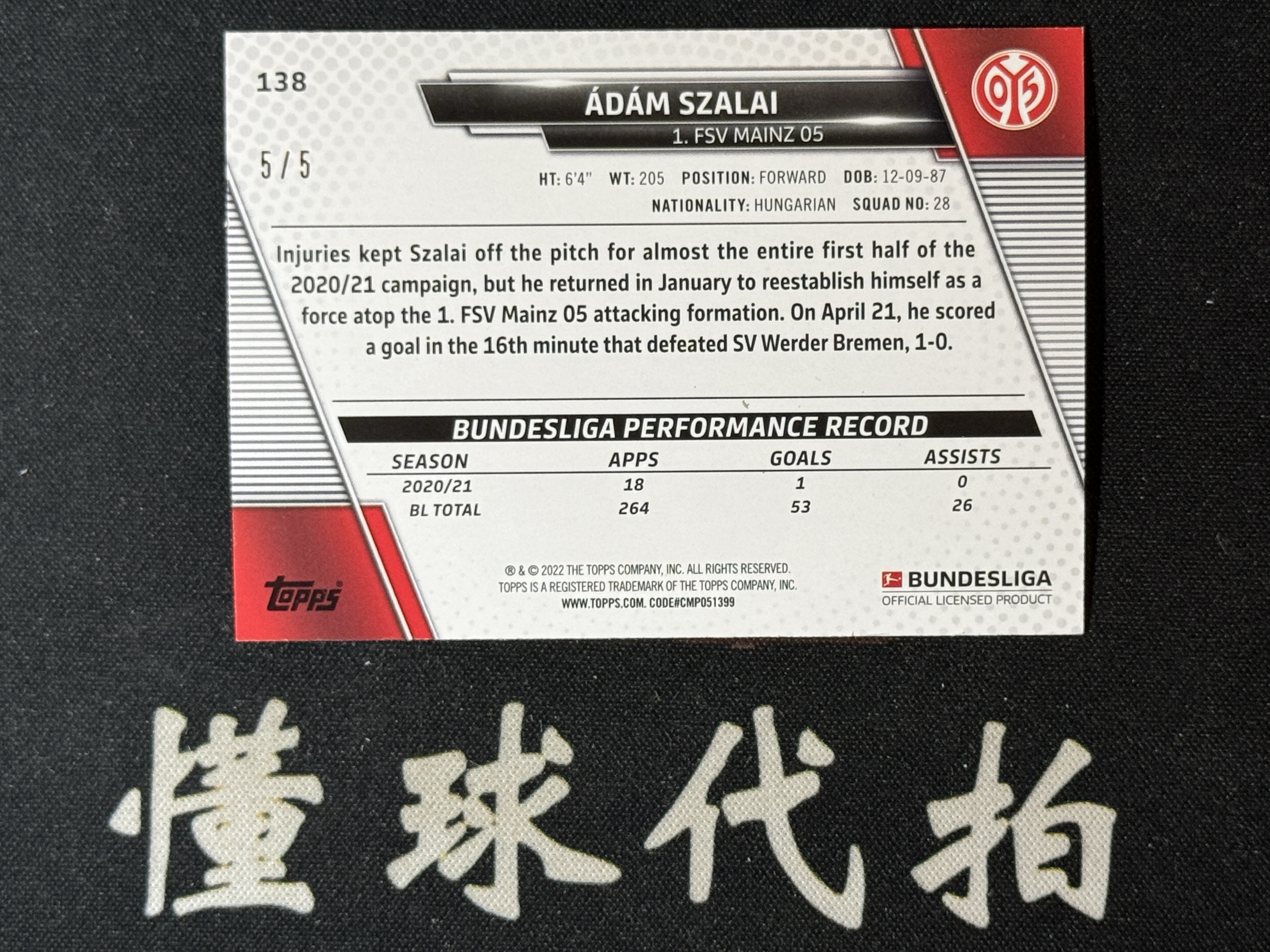 【懂球代拍】2021-22 topps ucc德甲collection 限量 5/5编 Adam szalai绍洛伊 美因茨 红折折射 尾编1/1 值得收藏 DQ076A 023