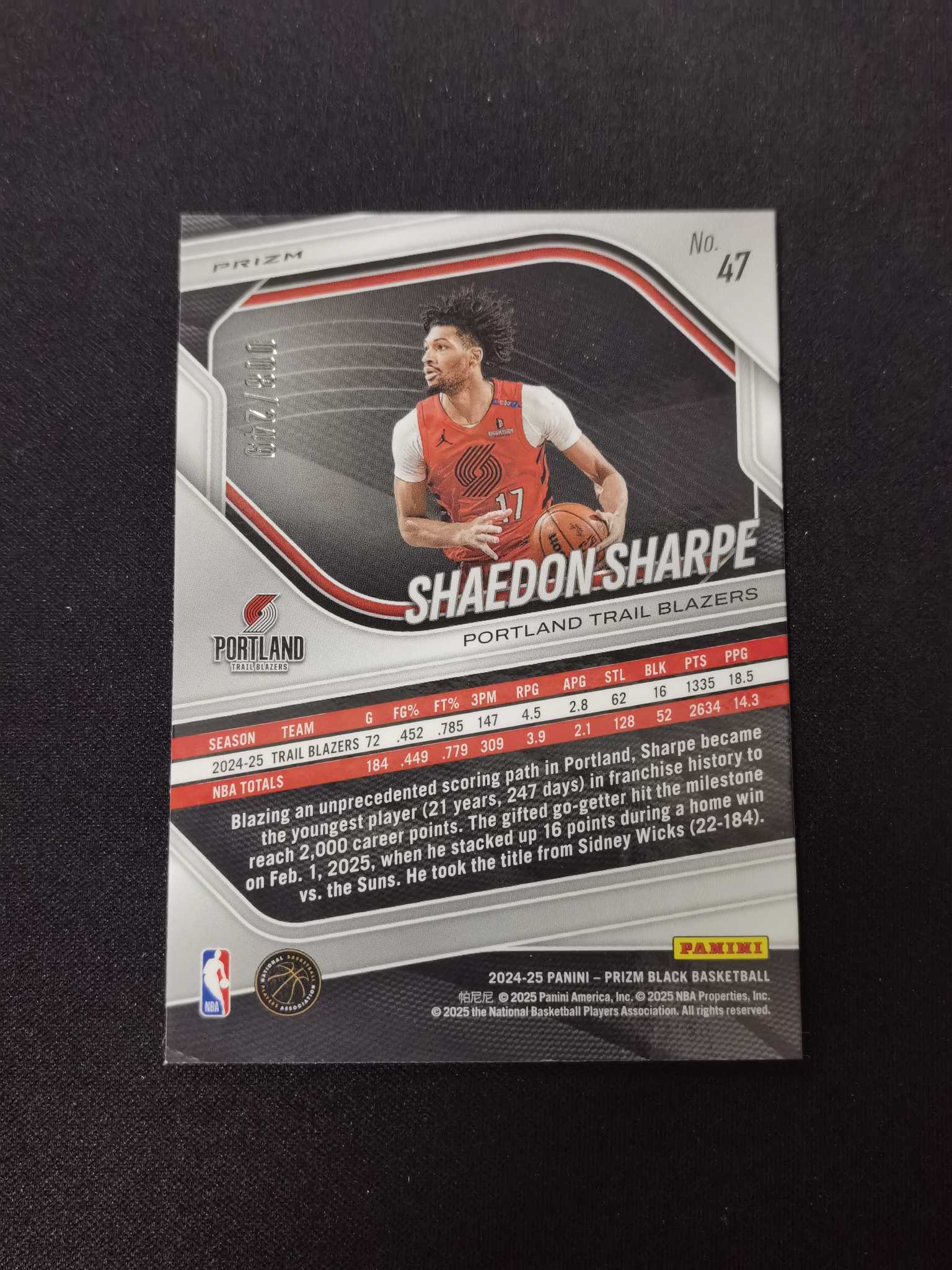 2024-25 Panini prizm black Shaedon Sharpe 谢登 夏普!帕尼尼末年绝唱,pz black系列249编地震折瀑布折!专收投资俱佳,可搏psa高分!长期看涨!