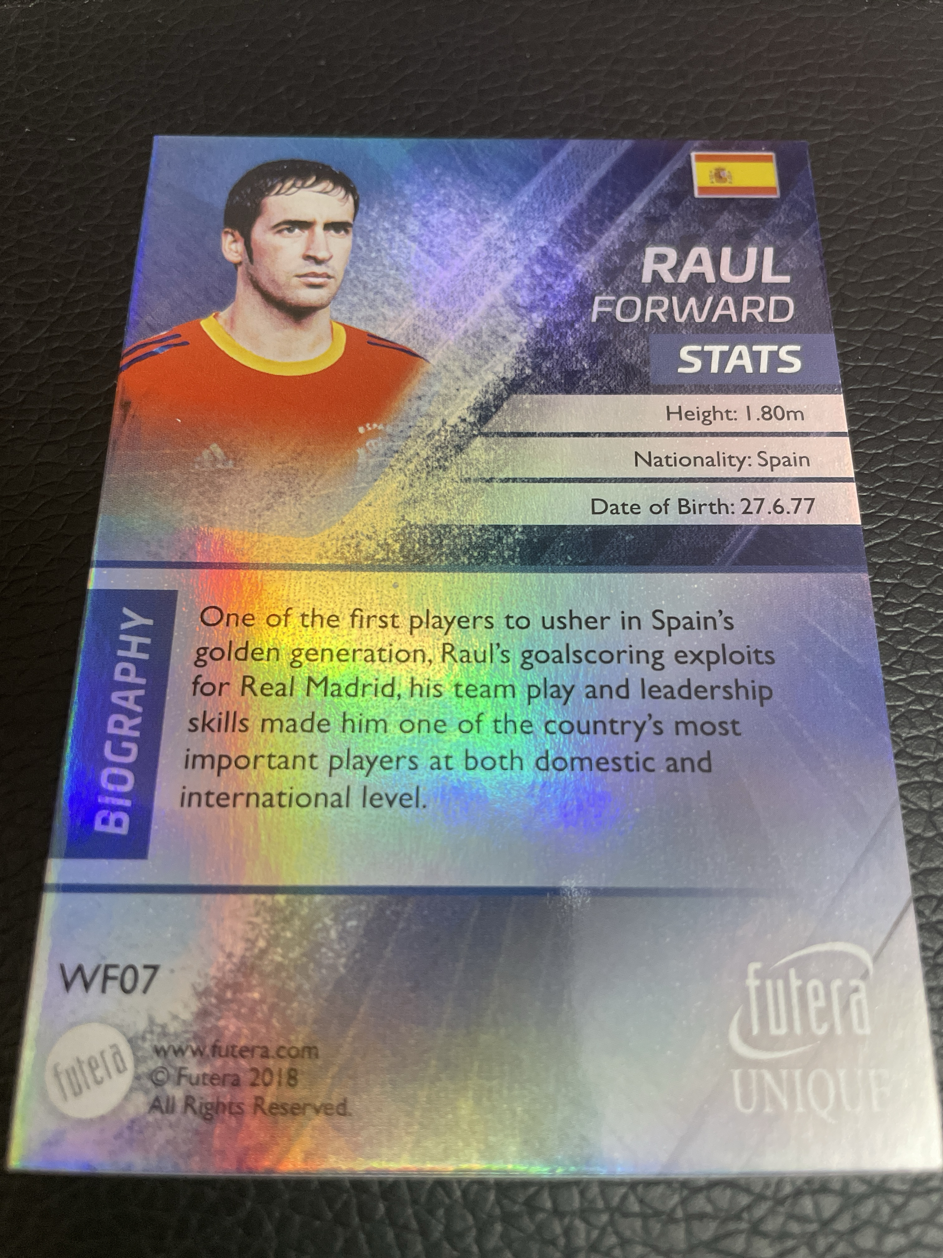 2018 futera unique福特拉 劳尔 西班牙国家队 皇马 西班牙斗牛士 皇马传奇7号 世界足球传奇 银卡 欧冠 卡品如图 老卡会有轻微镶嵌印痕 介意勿拍