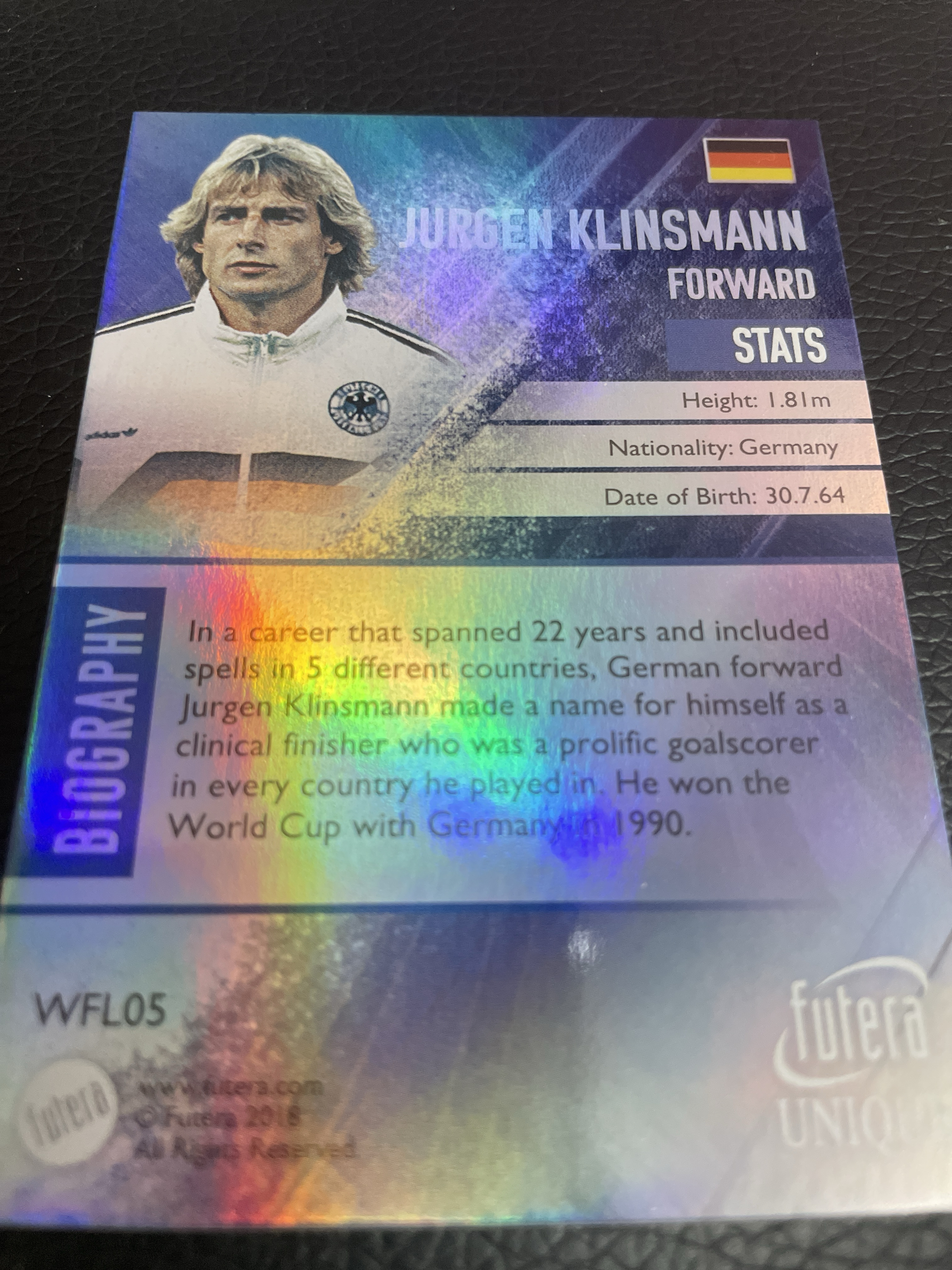 2018 futera unique福特拉 克林斯曼 金色轰炸机 德国国家队 世界足球传奇 银卡 欧冠  欧洲杯冠军 卡品如图 老卡会有轻微镶嵌印痕 介意勿拍