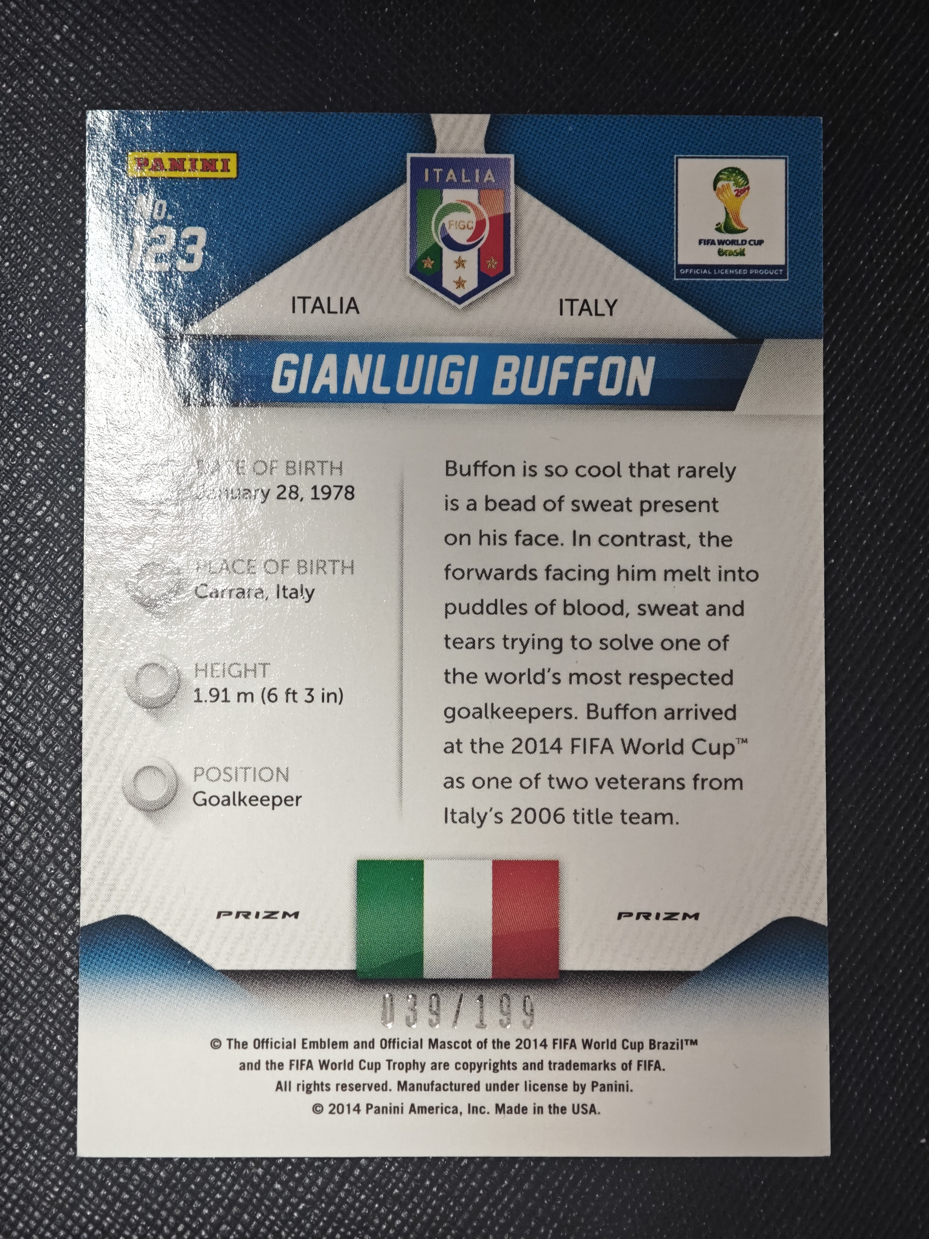 2014 Panini World Cup Prizm Gianluigi Buffon 布冯 元年 意大利 Italy 尤文 JUV 199编 传奇小将 正base 蓝衣军团 蓝配蓝 老卡稀有!