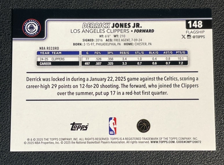 2025 Topps NBA Flagship Derrick Jones Jr. 761 小德里克 琼斯 快船 折射 红折 2/5编 横版 变化版 微瑕如图 卡品如图 白白