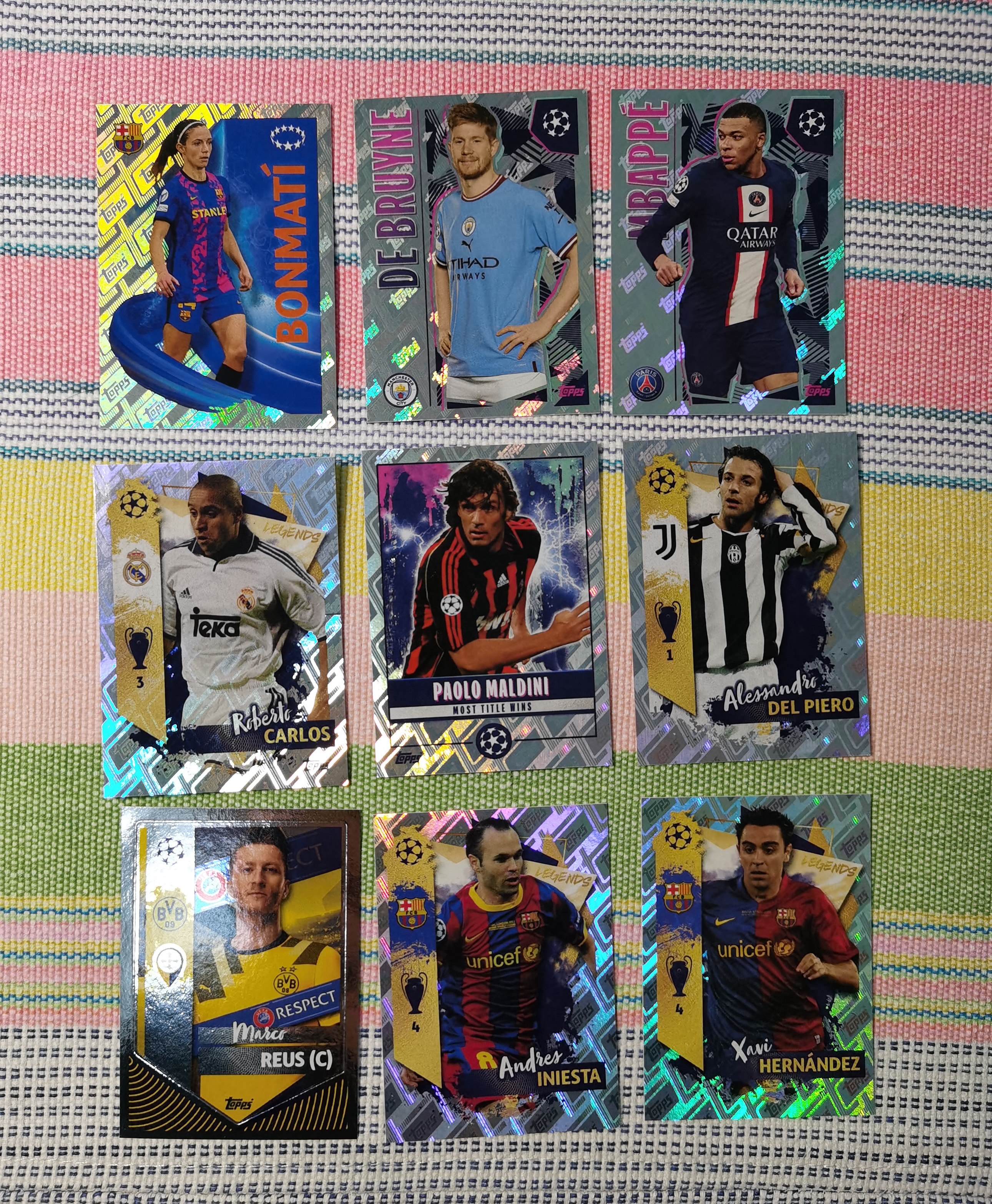 2022-23 Topps 欧冠贴纸 折射 邦马蒂 姆巴佩 德布劳内 哈维 伊涅斯塔 皮耶罗 马尔蒂尼 罗伯特 卡洛斯 罗伊斯