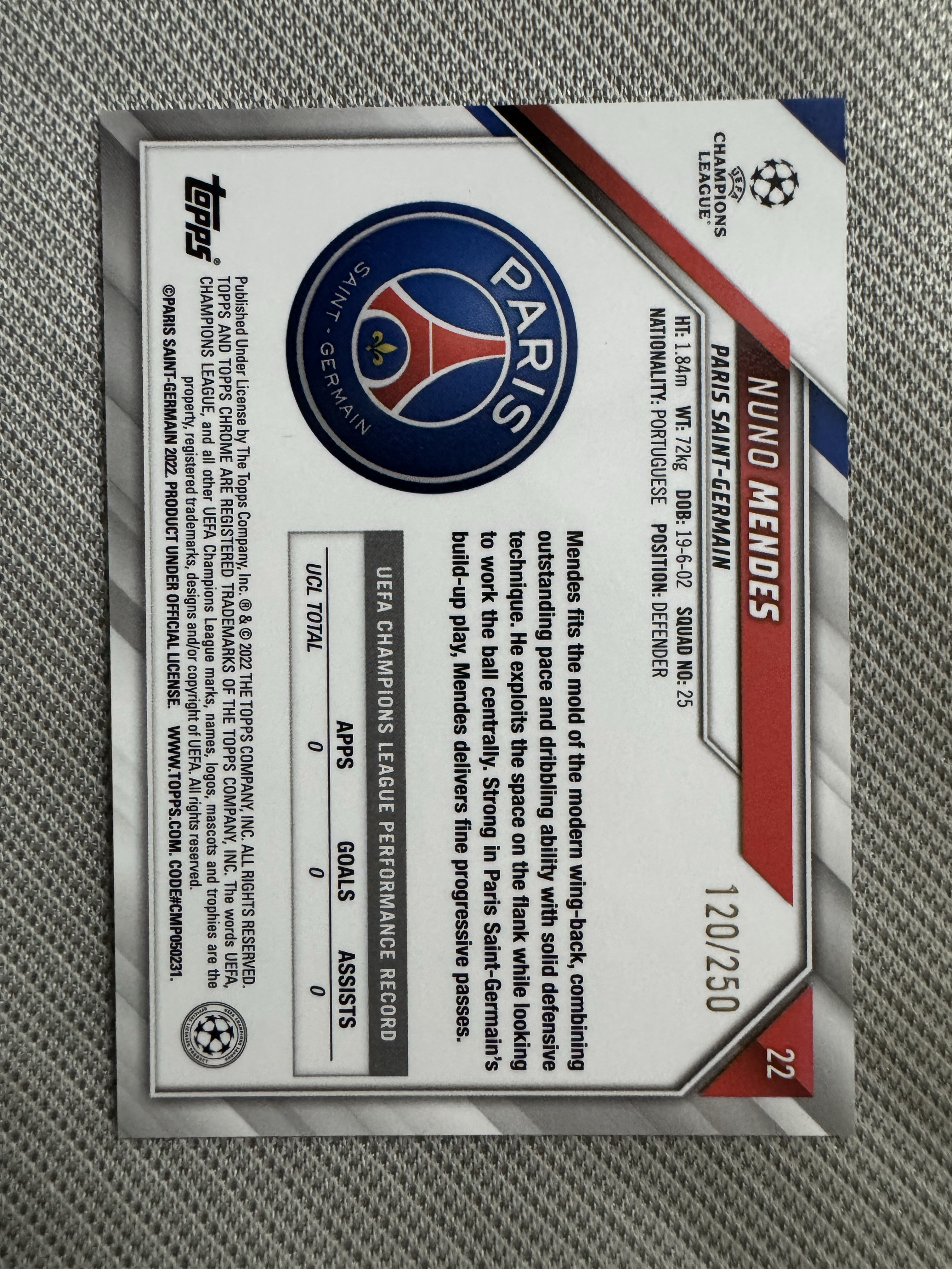 2021-22 Topps UEFA Champions League Nuno Mendes RC 努诺 门德斯 rc 新秀年 紫折 250编 超稀有 巴黎圣日耳曼 C罗 队友 葡萄牙 欧冠