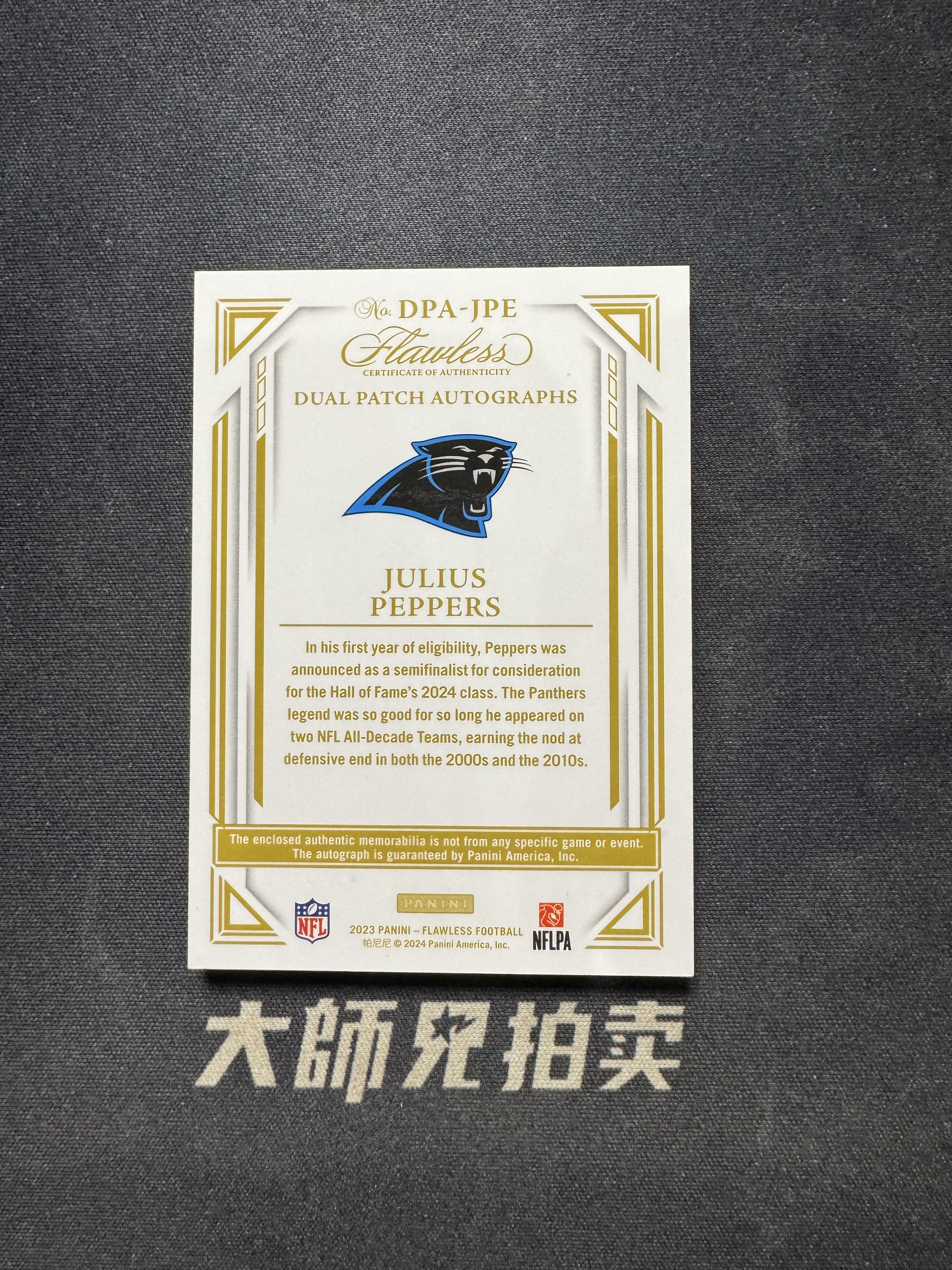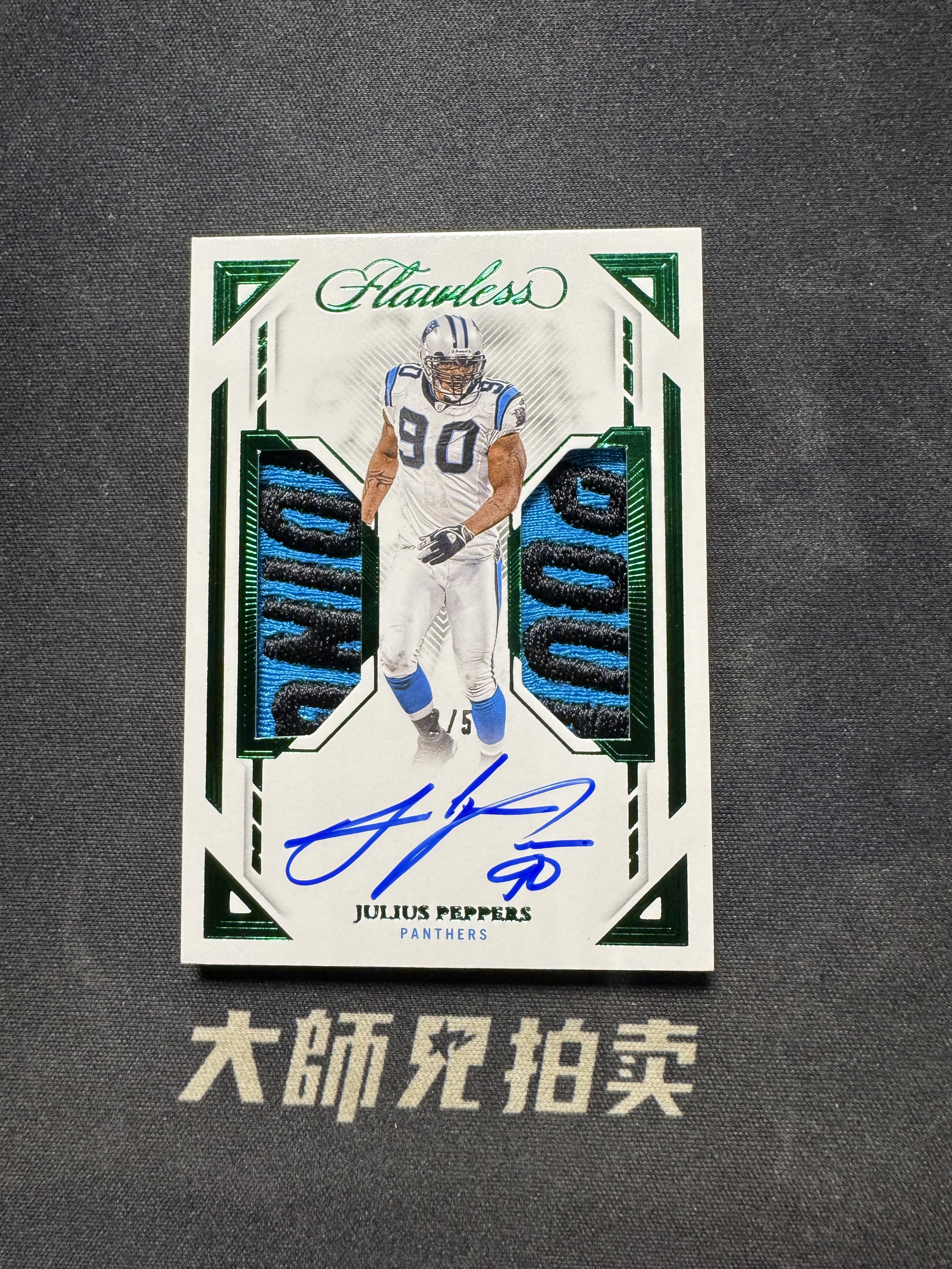 【大师兄拍卖】2023 Flawless JULIUS PEPPERS NFL 橄榄球 黑豹 朱利叶斯 佩普斯 手提 /5编 绿平行 签字 卡签 腰子 双窗球衣patch 字母切割 -Norman-