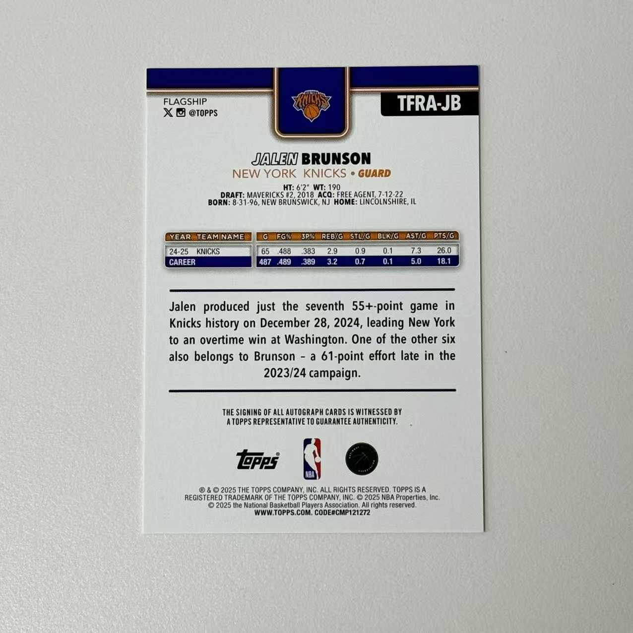 【浩冉拍卖】2025-26 Topps Flagship nba 尼克斯 Jalen Brunson 杰伦 布伦森 大头 签字 卡签 卡品如图 无敌车队