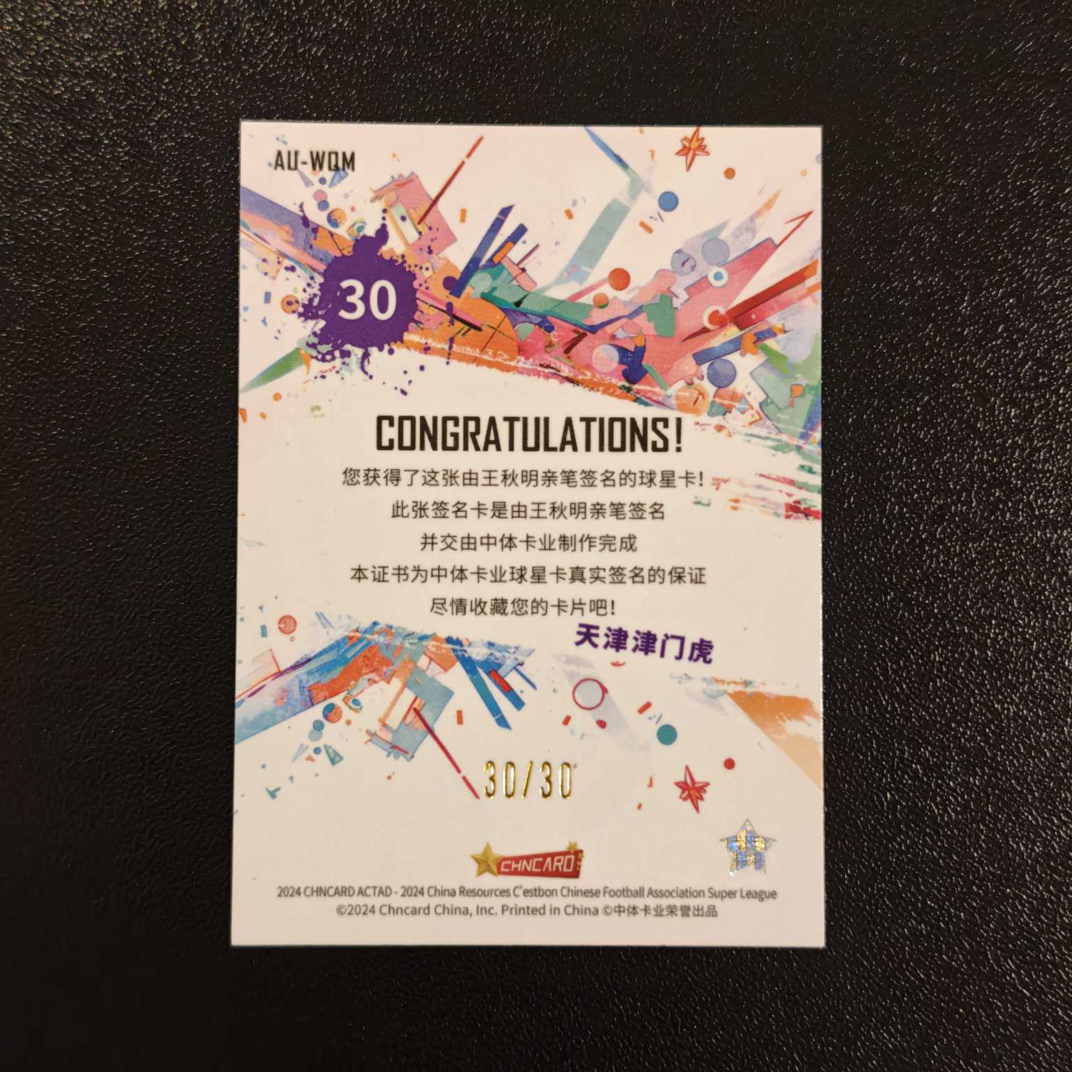 【HY拍卖】2024 中体卡业 CSL ACTAD(中超渲染) 30/30编 尾编 3同背 天津津门虎 天津泰达 王秋明 签字 银折 折射 专收必备 不保卡品