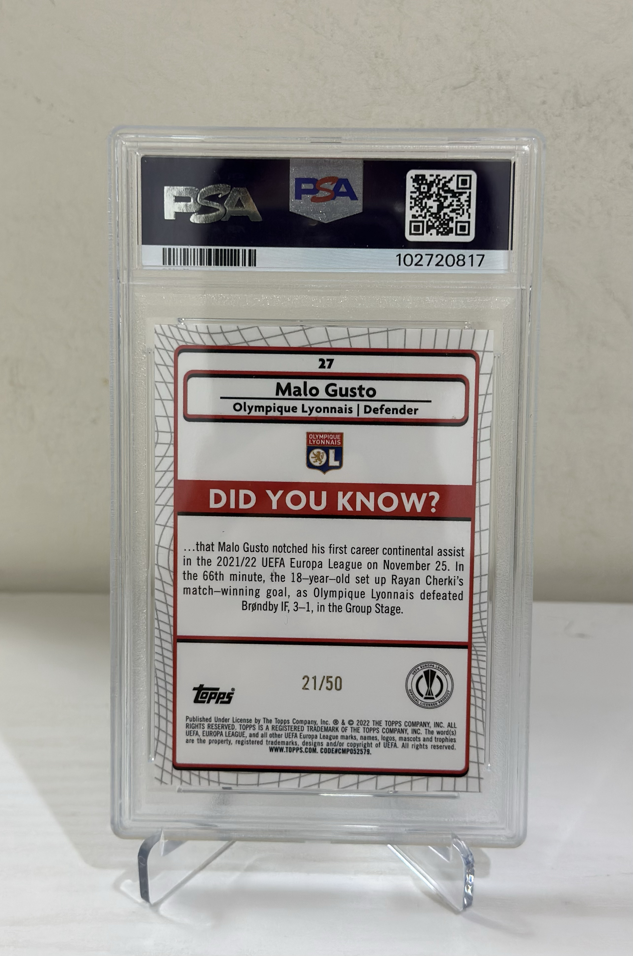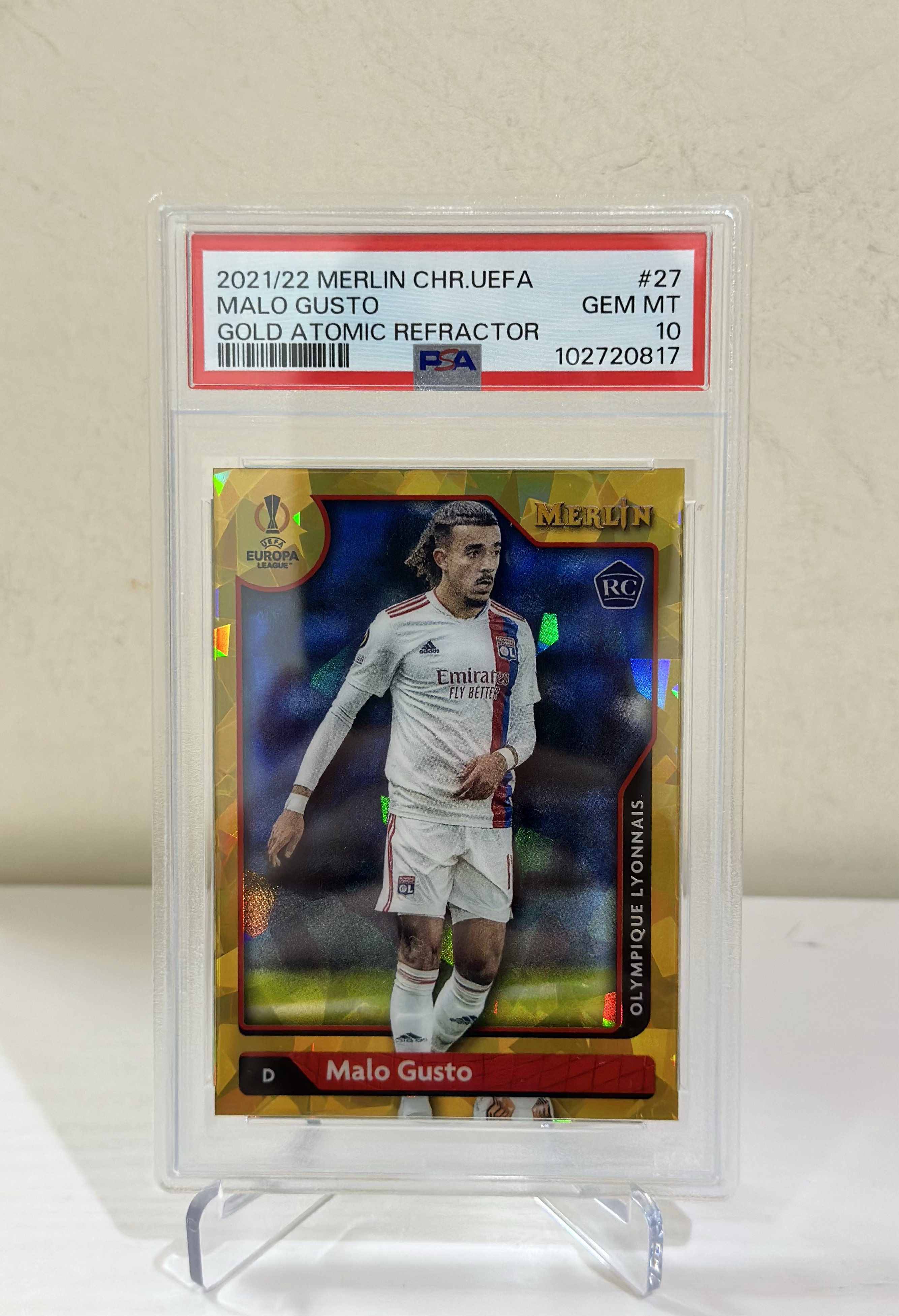 2021-2022 Topps Merlin chrome Malo Gusto RC 欧冠 梅林 里昂 切尔西 新秀 马洛 古斯托 金碎冰折 折射 Base 21/50编 评级卡 PSA评级10分