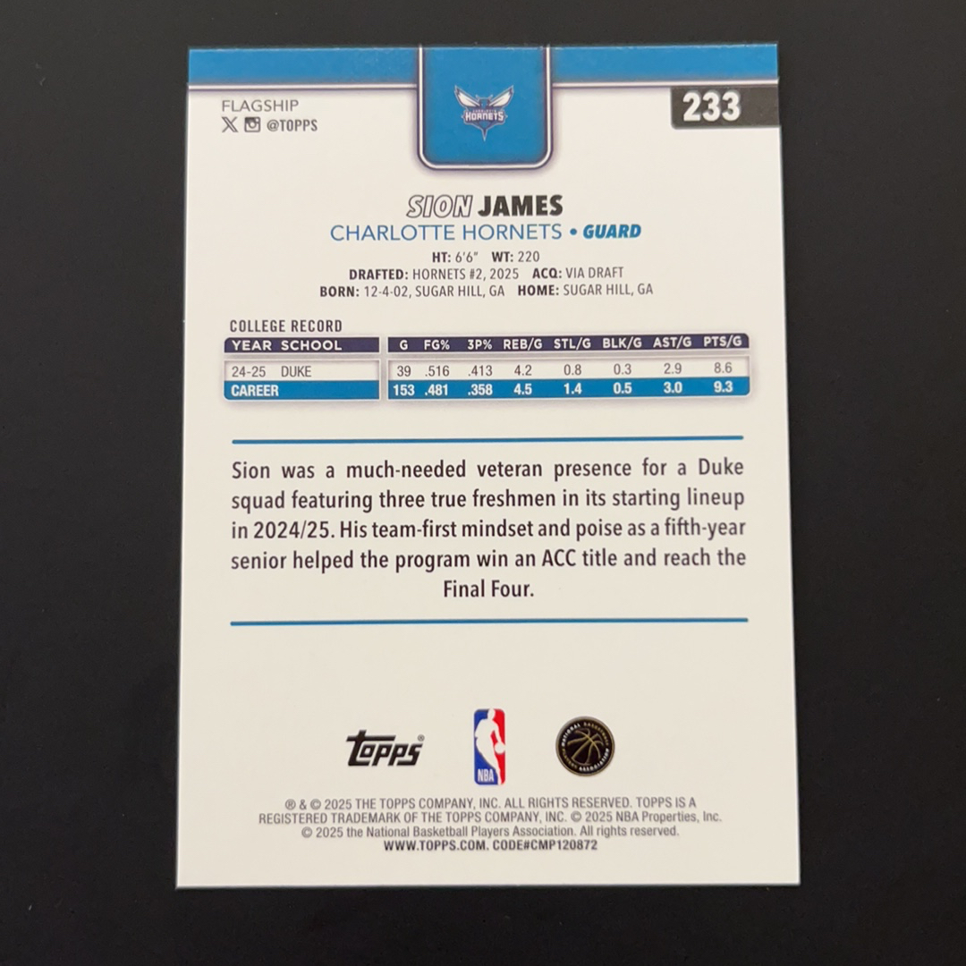 2025 Topps Flagship Sion James RC Topps 黄蜂队 希恩 詹姆斯 RC 新秀 1839/2025编 卡品如图 肆