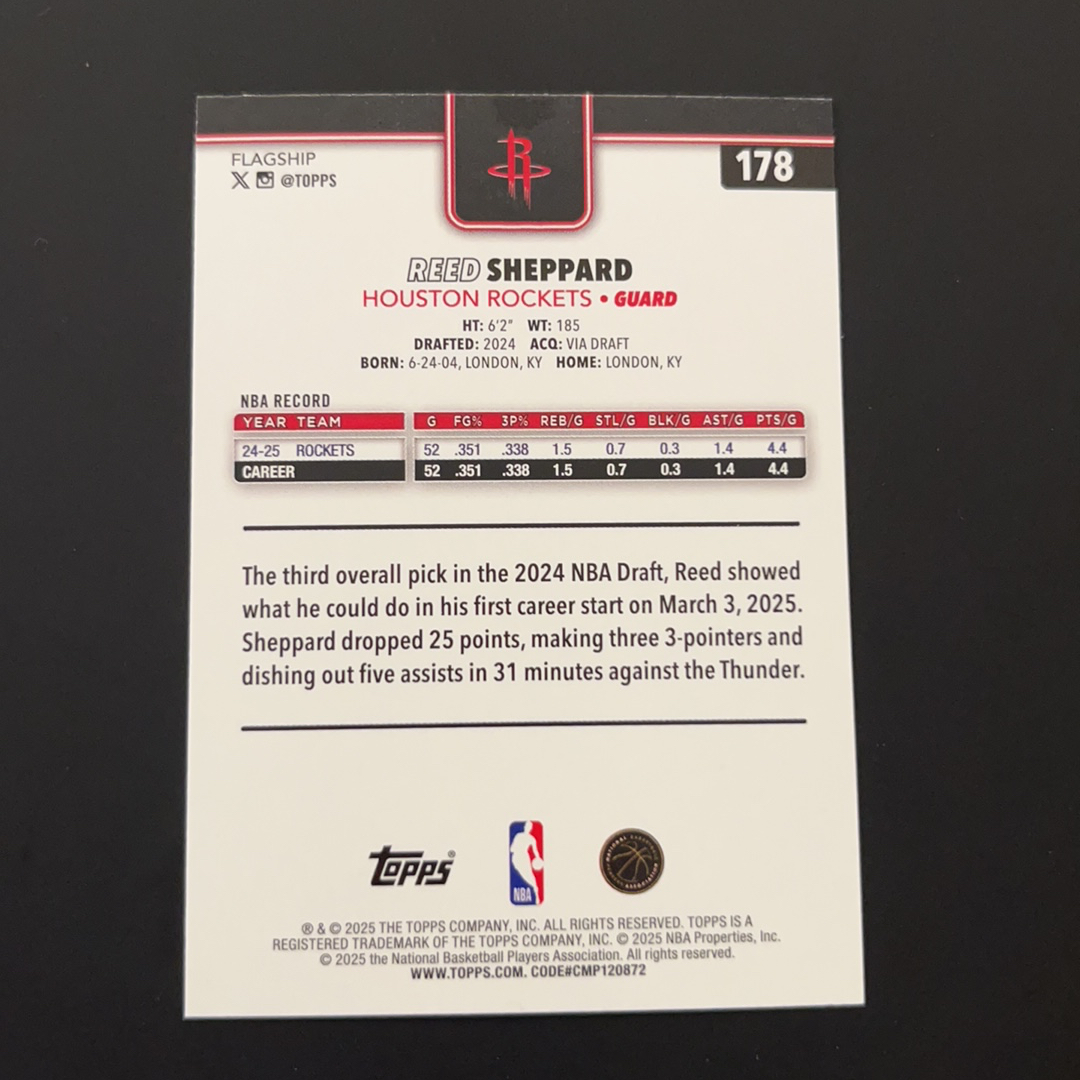 2025 Topps Flagship Reed Sheppard Topps 火箭队 里德谢泼德 紫折134/250编 未来可期 卡品如图 肆