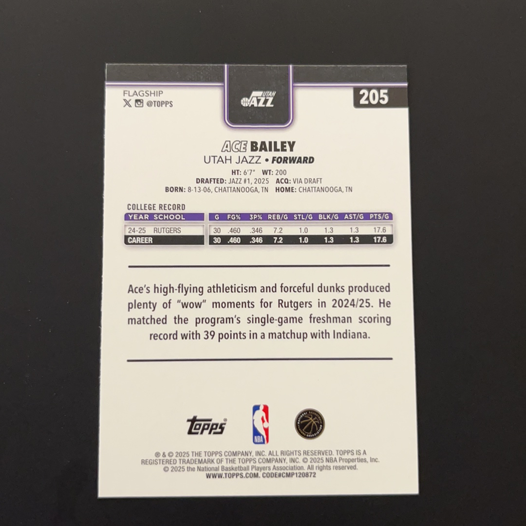 2025 Topps Flagship ACE BAILEY RC TOPPS 爵士队 埃斯贝利 RC 新秀 5号秀 826/2025编 未来可期 卡品如图 肆