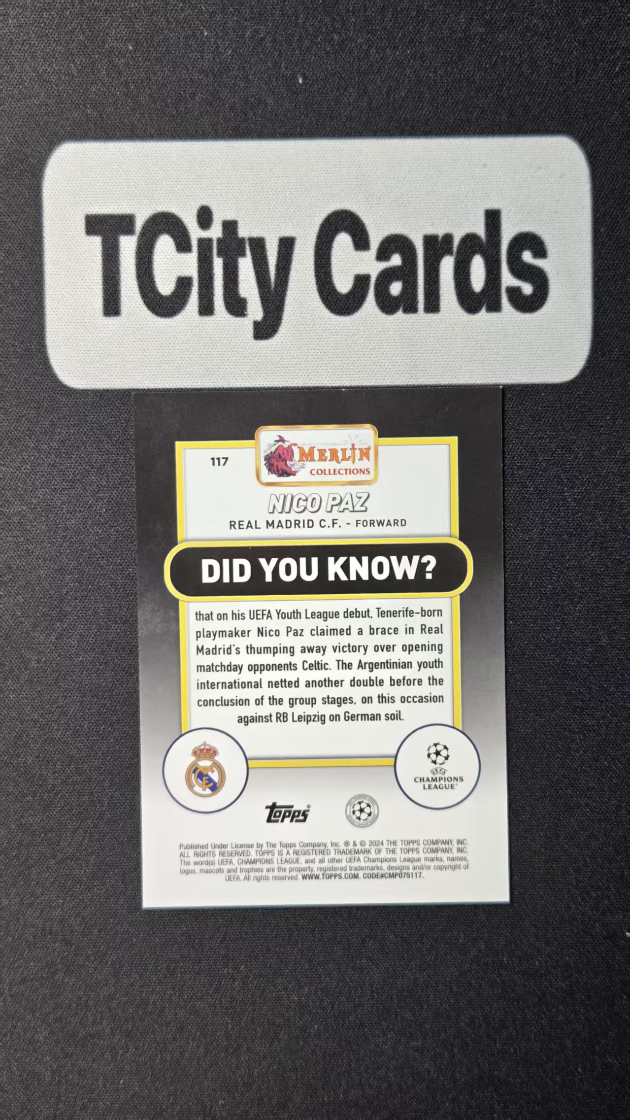 2024 Topps Merlin Nico Paz RC 梅林 新秀RC 皇家马德里 尼科 帕斯 帕兹 275编 阿根廷 科莫 可乐