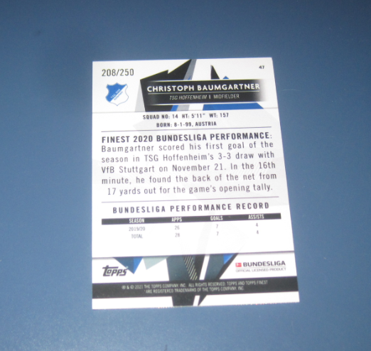 2020-21 Topps Finest Christoph Baumgartner 【凯哥拍卖】 德甲 球星卡 折射 限量 带编 250编 霍芬海姆 鲍姆加特纳 极微小瑕疵 品相如图