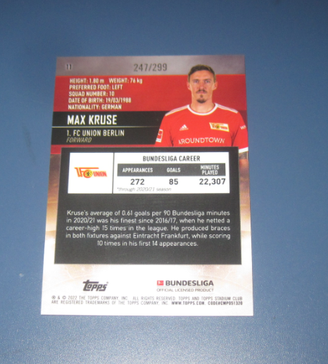 2020-21 Topps Stadium Club Chrome KRUSE 【凯哥拍卖】 德甲 球星卡 竞技场 限量 299编 柏林联盟 克鲁泽 极微小瑕疵 品相如图