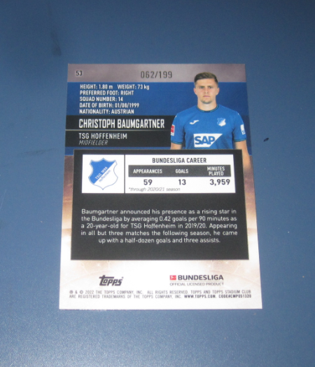 2020-21 Topps Stadium Club Chrome Christoph Baumgartner 【凯哥拍卖】 德甲 竞技场 限量 199编 霍芬海姆 鲍姆加特纳 极微小瑕疵 品相如图