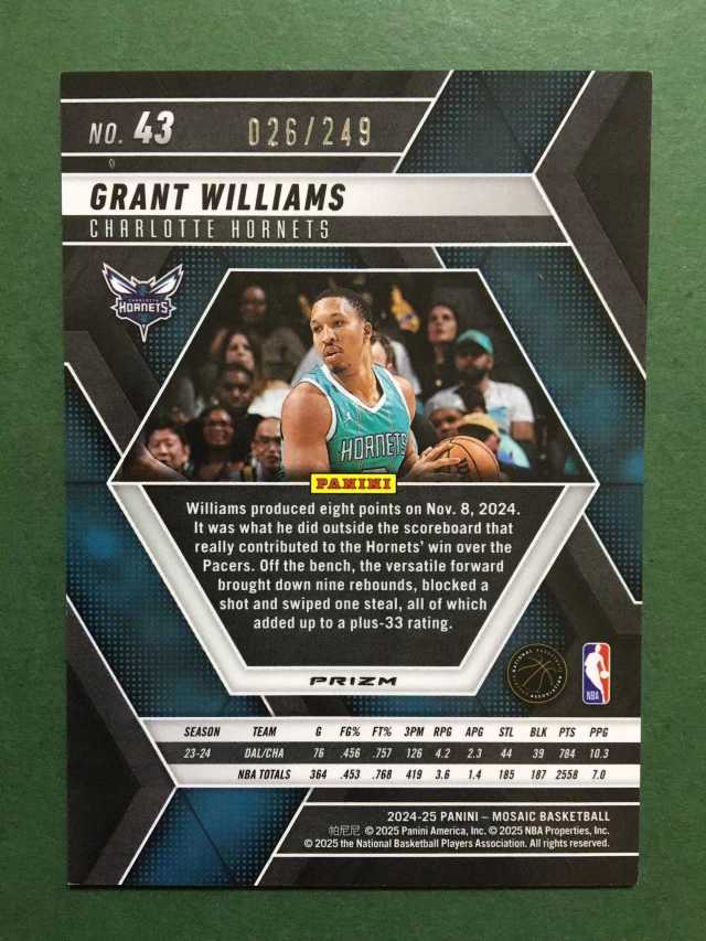 2024-25 Panini Mosaic Grant Williams 马赛克 黄蜂 格兰特 威廉姆斯 249编 橙马赛克折 橙折 折射 正base 三球 米勒 萨隆队友 凑套必备 卡品如图#一百