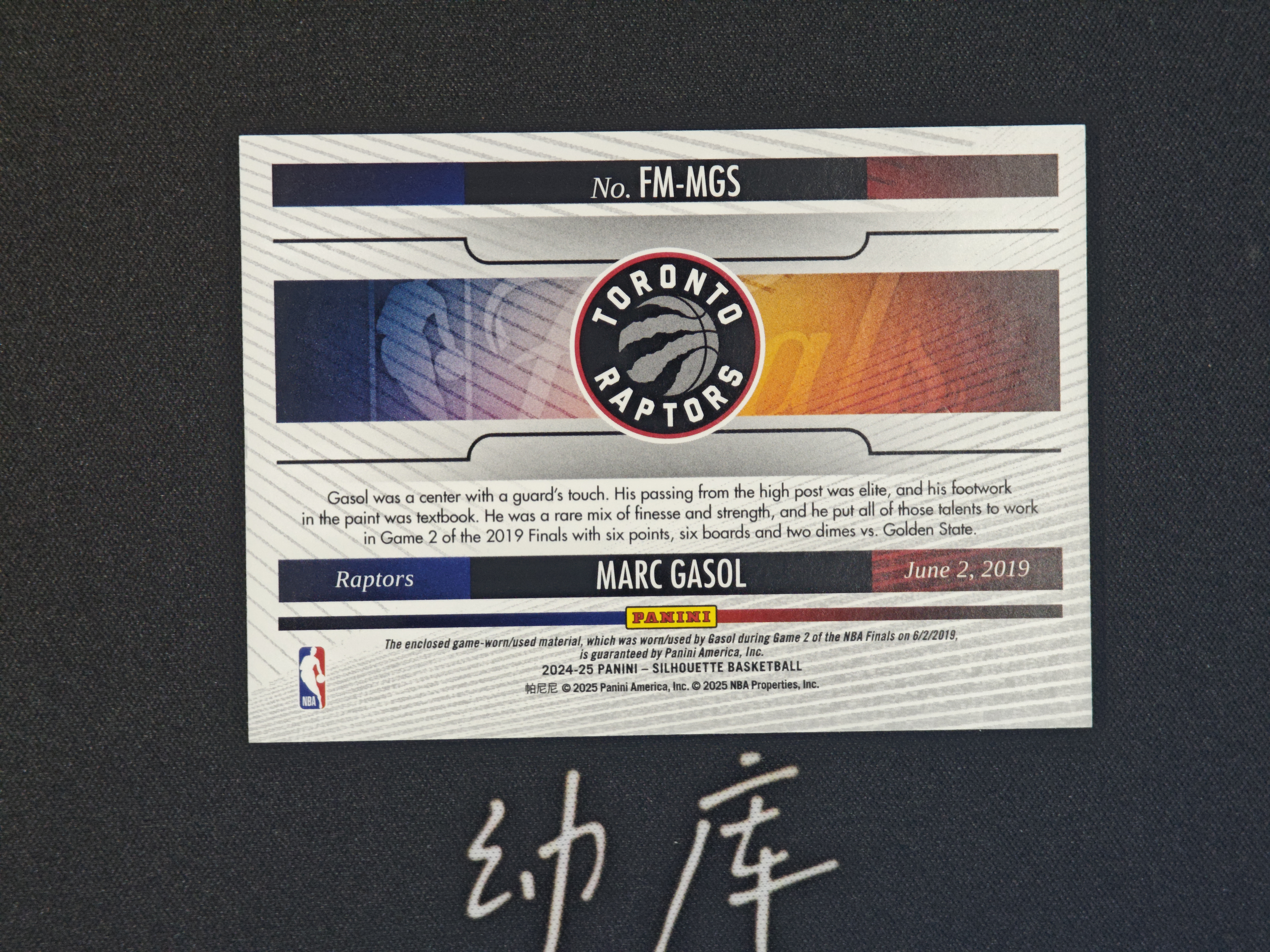 2024-25 Panini Silhouette Marc Gasol 剪影「幼库拍卖」马克 加索尔 猛龙 NBA Finals 总决赛 小窗 GU 落场 亲穿 球衣 物料 卡品如图