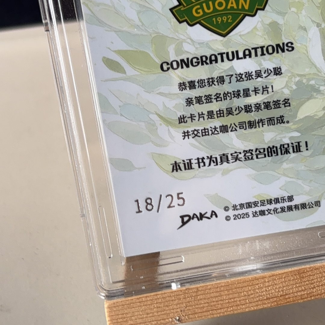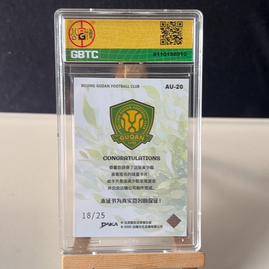 【树树拍卖 杨哥北京国安专场】DAKA 2025 北京国安 队盒  GBTC 公博 评级 9分 签字 10分 卡签 银平行 低编 签字 /25编 吴少聪 WU SHAOCONG AU-20