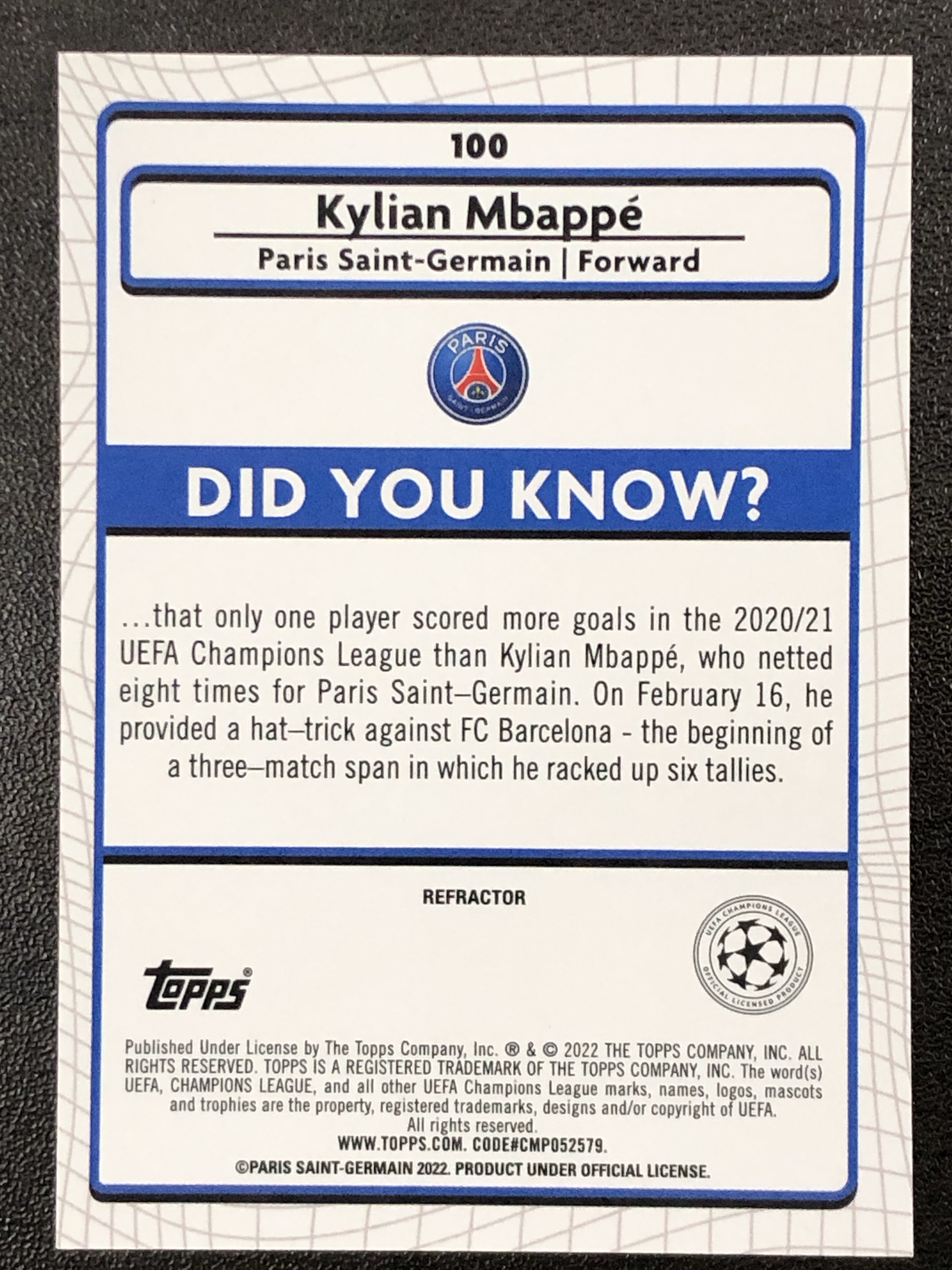 2022 Topps UEFA Champions League Kylian Mbappe topps系列 欧冠 基利安 姆巴佩 佩总监 法国超跑 银折 折射 法国 大巴黎 专收必备 卡品如图