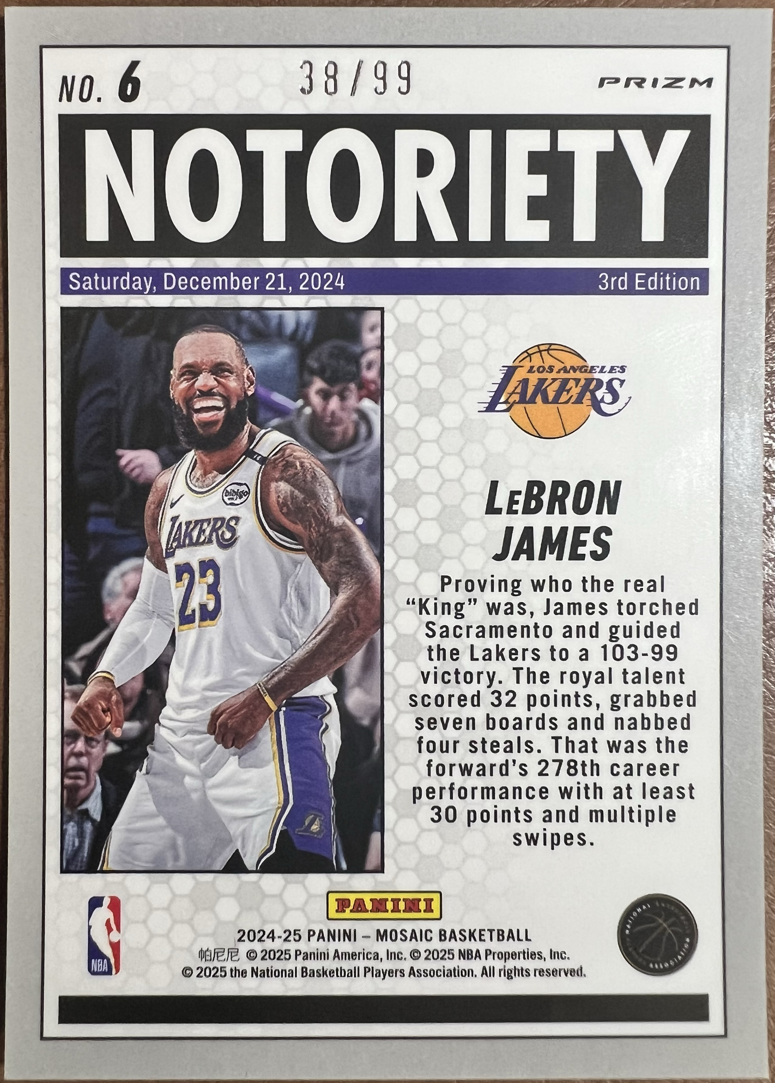 2024-25 Panini Mosaic LeBron James /泰欧气卡社 / PZ 马赛克 大比例特卡 勒布朗 詹姆斯 38/99编 卡品如图