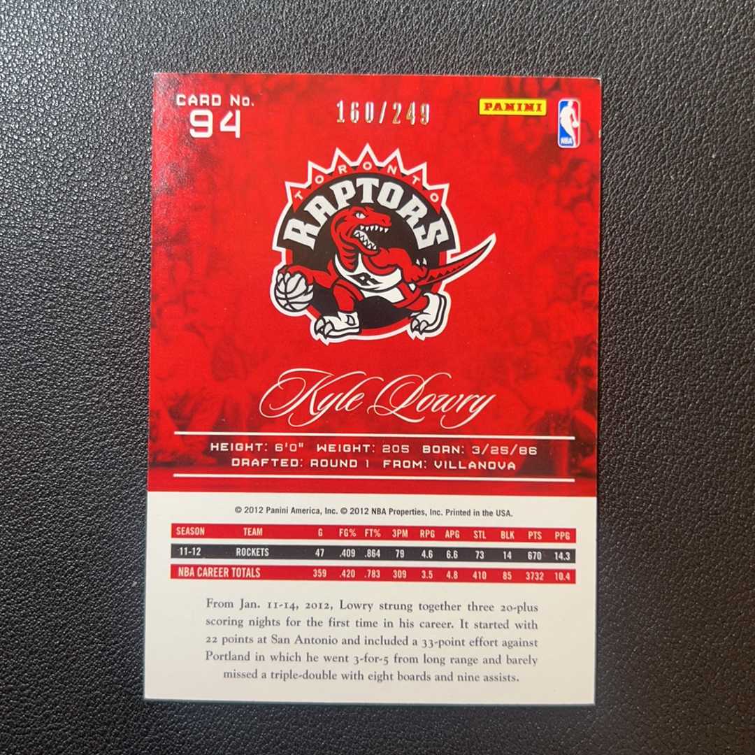 2012 Panini Prestige Kyle Lowry 篮球 荣耀系列 洛瑞 火箭 249编 轻印- S00009