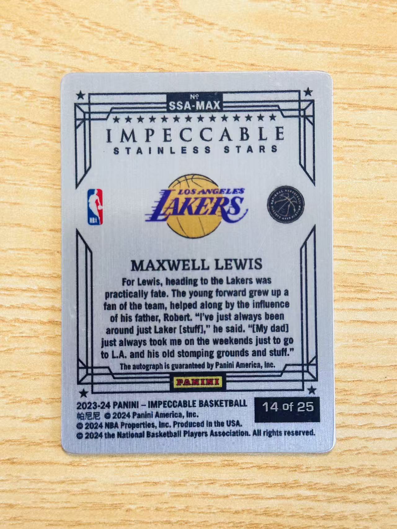 2023-24 Panini Impeccable Maxwell Lewis 嘿嘿代卖 小真金 马克斯韦尔 刘易斯 新秀 RC 铁板 签字 卡签 橙折 25编 湖人 收藏必备
