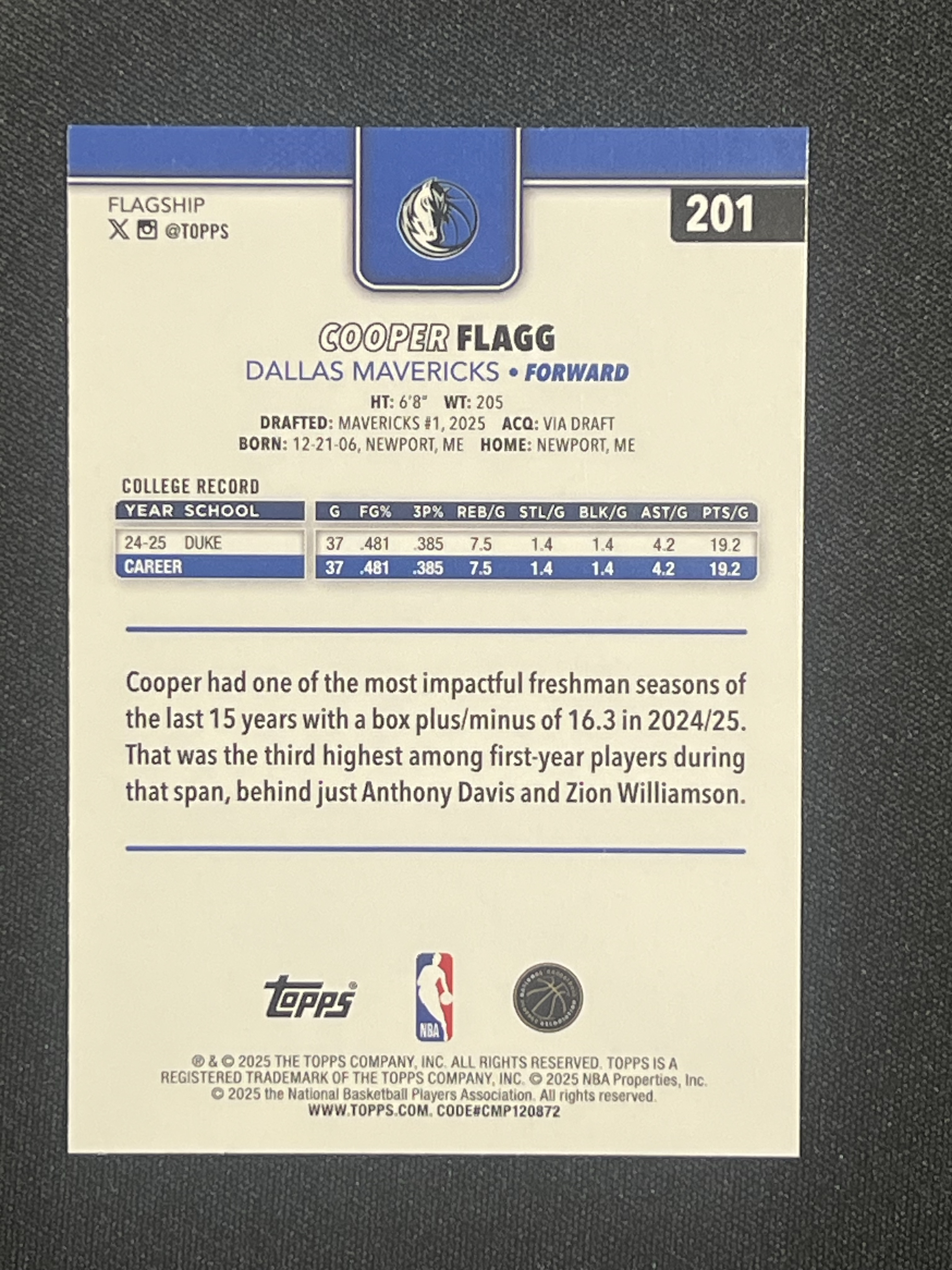 【卡卡星拍卖】2025 Topps Flagship Cooper Flagg RC 库珀 弗拉格 独行侠 状元 新秀  卡品如图 cory