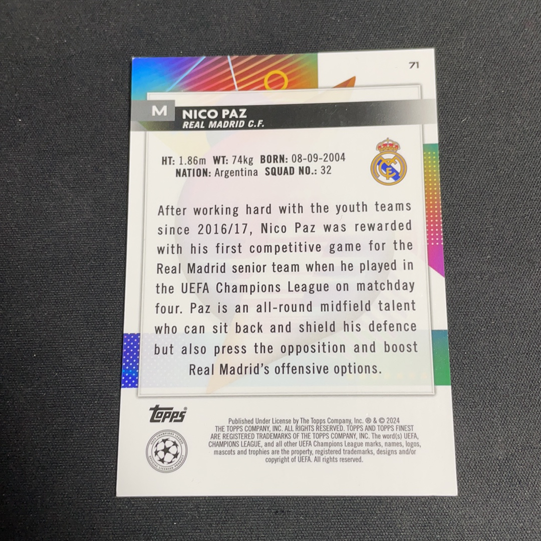 2024 Topps UEFA Champions League Nico Paz RC 欧冠Finest 皇马 尼科 帕兹 帕斯 大热新秀 RC 豪门猎物 青折 250编 卡品微瑕 介意勿拍