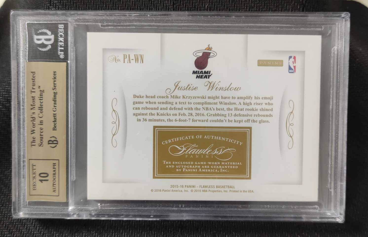 2015-16 Panini Flawless Justise Winslow RC 贾斯蒂斯 温斯洛 新秀rc 卡签 签字 球衣卡 10/10编 尾编 rpa 暴力切割patch bgs9.5分评级卡