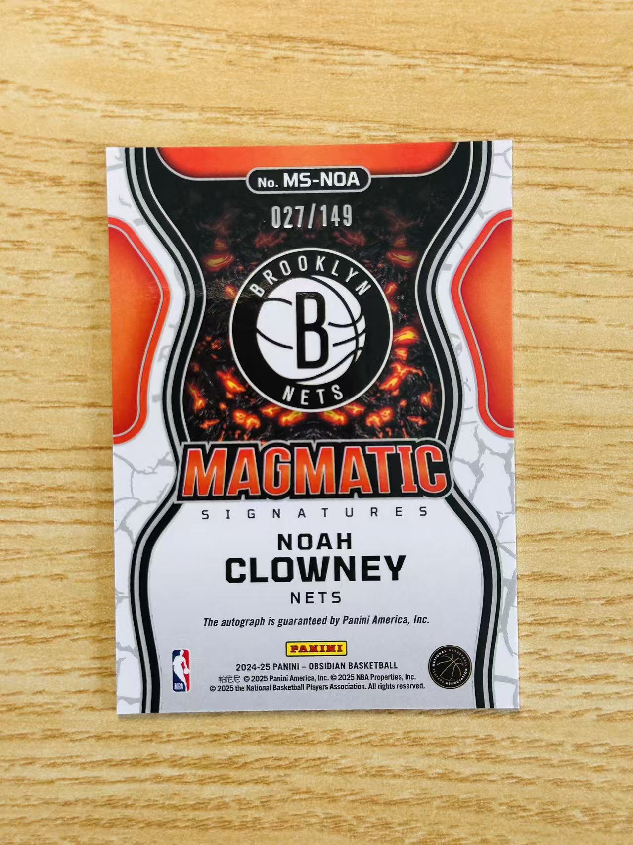 2024-25 Panini Obsidian Noah Clowney 嘿嘿代卖 黑曜石 诺阿 克洛尼 签字 红折 149编 篮网 收藏必备
