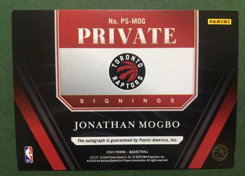2024-25 Panini Mosaic Jonathan Mogbo RC 马赛克 新秀 猛龙 乔纳森 莫格博 PRIVATE 横版插入签字 卡签 银折 折射 布泽利斯同届 卡品如图#十四