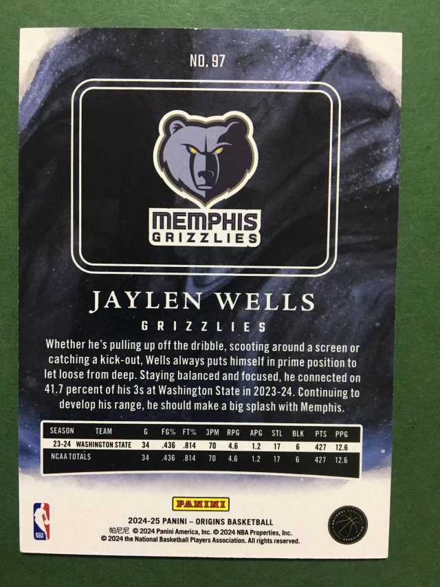 2024-25 Panini Origins Jaylen Wells RC 起源 新秀 灰熊 杰伦 威尔斯 60编 base 白平行 里萨谢 谢泼德同届 莫兰特队友 未来可期 卡品如图#十五