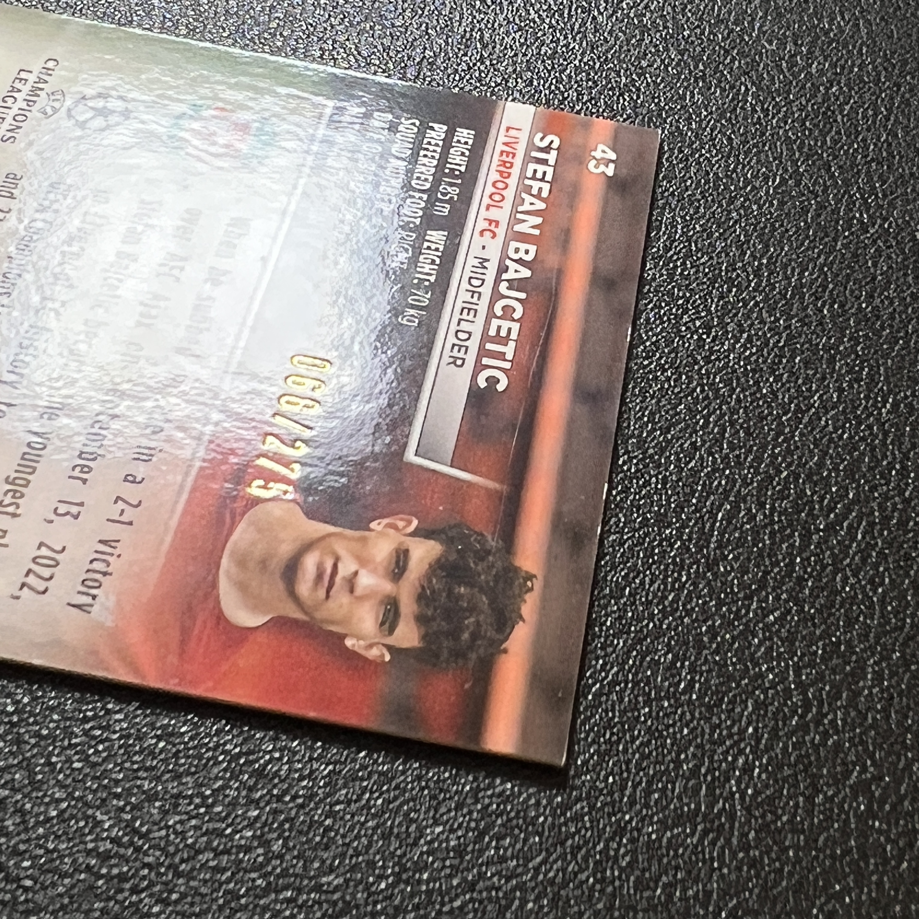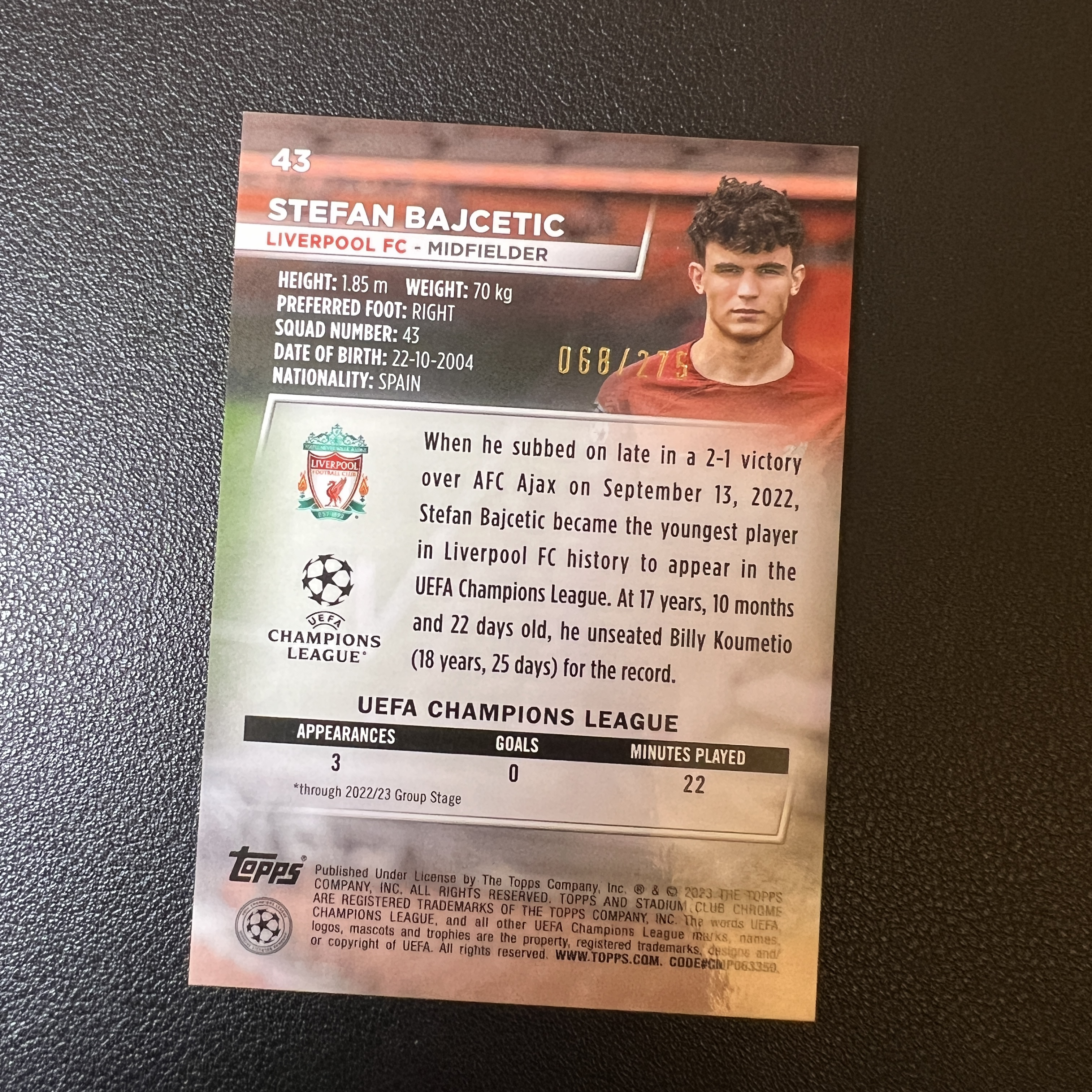 2023 Topps Stadium Club Chrome Stefan Bajcetic RC 欧冠 竞技场 西班牙 利物浦 新秀 巴伊切蒂奇 275编 青波纹折射 实卡精美 轻印-SY5343