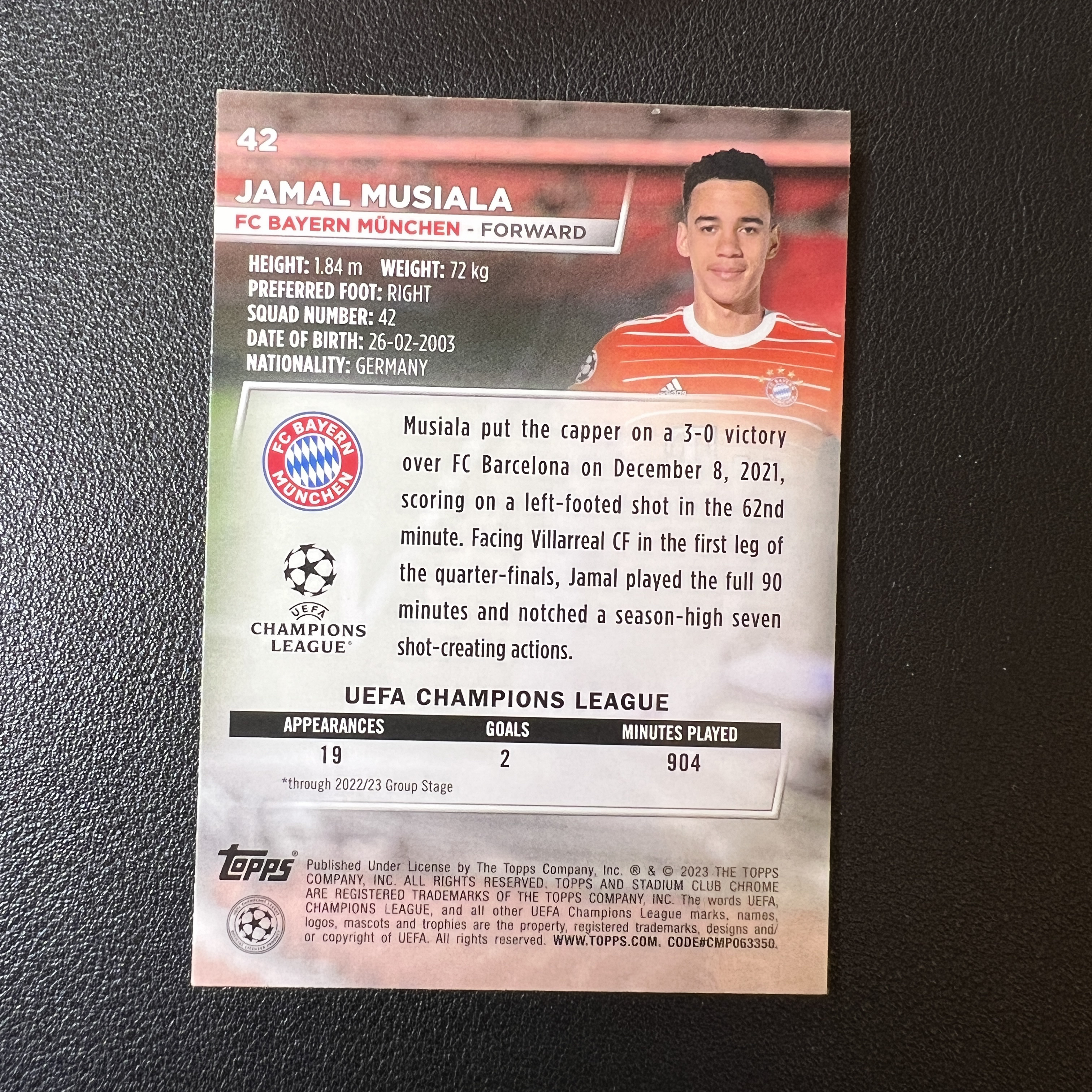 2023 Topps Stadium Club Chrome Jamal Musiala 欧冠 竞技场 德国 拜仁慕尼黑 太子爷 穆夏拉 折射 闪电折 实卡精美 轻印-SY5343